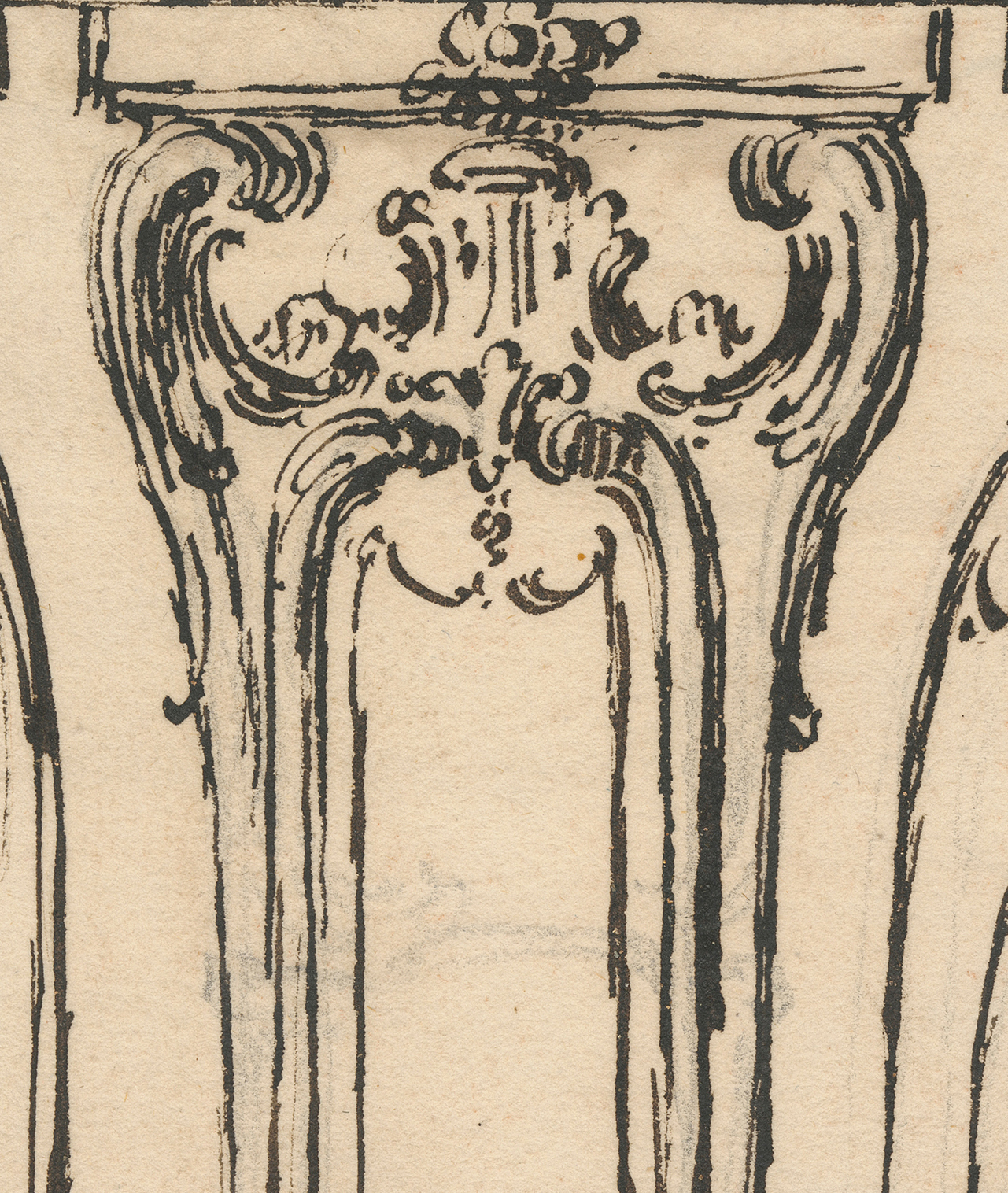 La liberté et la fluidité avec lesquelles est traité l’ordre ionique n’est pas sans rappeler les audacieux pilastres que Pineau a esquissé pour le château de Croix-Fontaine en 1744 (inv. 29187 B) : sont retenus le fleuron du corinthien, mais aussi l’idée de se servir du mouvement des acanthes pour dilater le pilastre. Il est aussi troublant de remarquer que les moulures encadrant la table se rejoignent en un fleuron exactement de la même manière entre le pilastre de Croix-Fontaine, le dessin CD 1713 et notre boiserie. À Croix-Fontaine, l’ordre ionique est traité avec tant de liberté et d’audace qu’il est impossible d’y voir une conception qui se voudrait classicisante. Définitivement, cette esquisse bas en brèche l’idée que le dessin CD 1713 serait le fruit d’une pensée néoclassique.