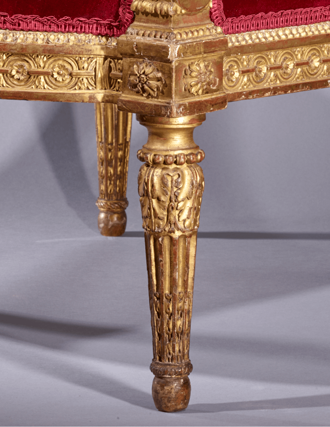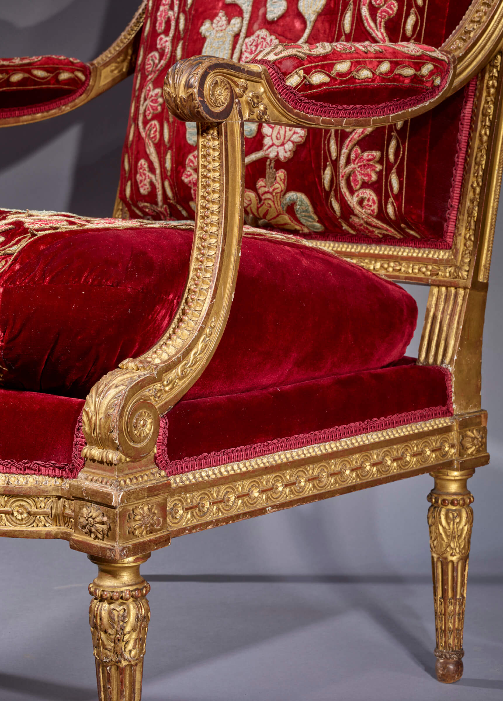 MARQUES ET INSCRIPTIONS : N° 3, marque manuscrite à l’encre noire visible à plusieurs reprises au revers des traverses de l’assise, et désignant le fauteuil n° 3 sur les quatre de cet ensemble livrés par Georges Jacob en 1781 ; lettres cursives T S incisées au revers de l’une des traverses de l’assise, cette inscription fut peut-être usitée pour désigner le palais des Tuileries sous la Révolution, le Consulat et l’Empire, ainsi que l’on peut également le voir sur des étiquettes imprimées, toutes aussi rares, visibles sur une suite de quatre fauteuils en bois doré (six à l’origine) exécutés par Jacob Frères, initialement commandés pour le palais du Directoire exécutif, actuel palais du Luxembourg, mais placé en 1800 au palais des Tuileries, dans le premier salon de Joséphine Bonaparte, au rez-de-chaussée de l’aile sud du palais ; ces fauteuils sont aujourd’hui conservés au Mobilier national, à Paris (inv. GMT 1445/004) ; E. de Rostchild [sic], inscription manuscrite au crayon noir, visible sous l’une des traverse de l’assise, et désignant le baron Edouard Alphonse James de Rothschild (1868-1949) ; R.MA., lettres capitales manuscrites à la peinture noire visible au revers de l’une des traverses de l’assise et signifiant Rothschild Marine, marque d’inventaire employée par l’Einsatzstab Reichsleiter Rosenberg (Équipe d’intervention du Reichsleiter Rosenberg), en charge de la confiscations de biens appartenant à des Juifs et à des francs-maçons dans les territoires occupés par les Allemands.