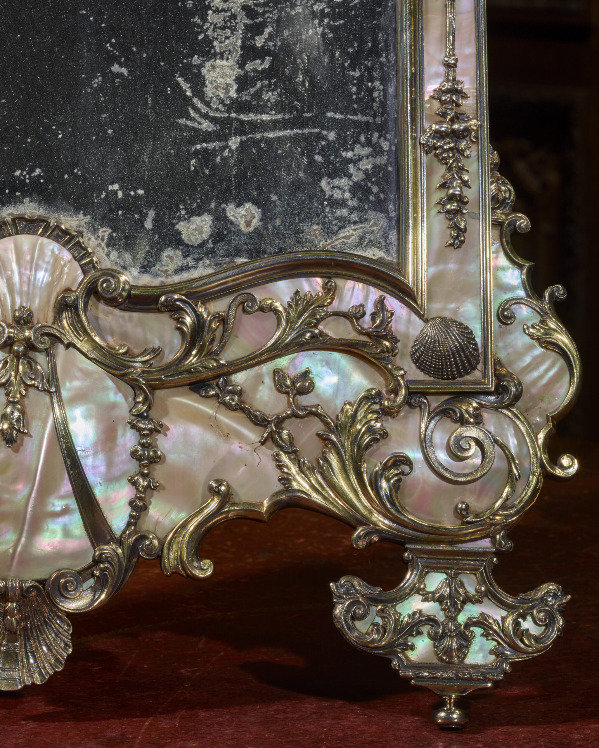 Un cartouche central similaire, terminé d’une coquille Saint-Jacques, occupe le centre de l’imposante traverse inférieure du miroir, formant débord et à découpe chantournée, supportée de part et d’autre par deux petits pieds à décor d’argent et de nacre en forme de ‘pelta’. Le sabot de bronze argenté terminant le pied ajouré de bois monté à charnières soutenant le miroir au revers est signé : Ed. AMORY Fecit.