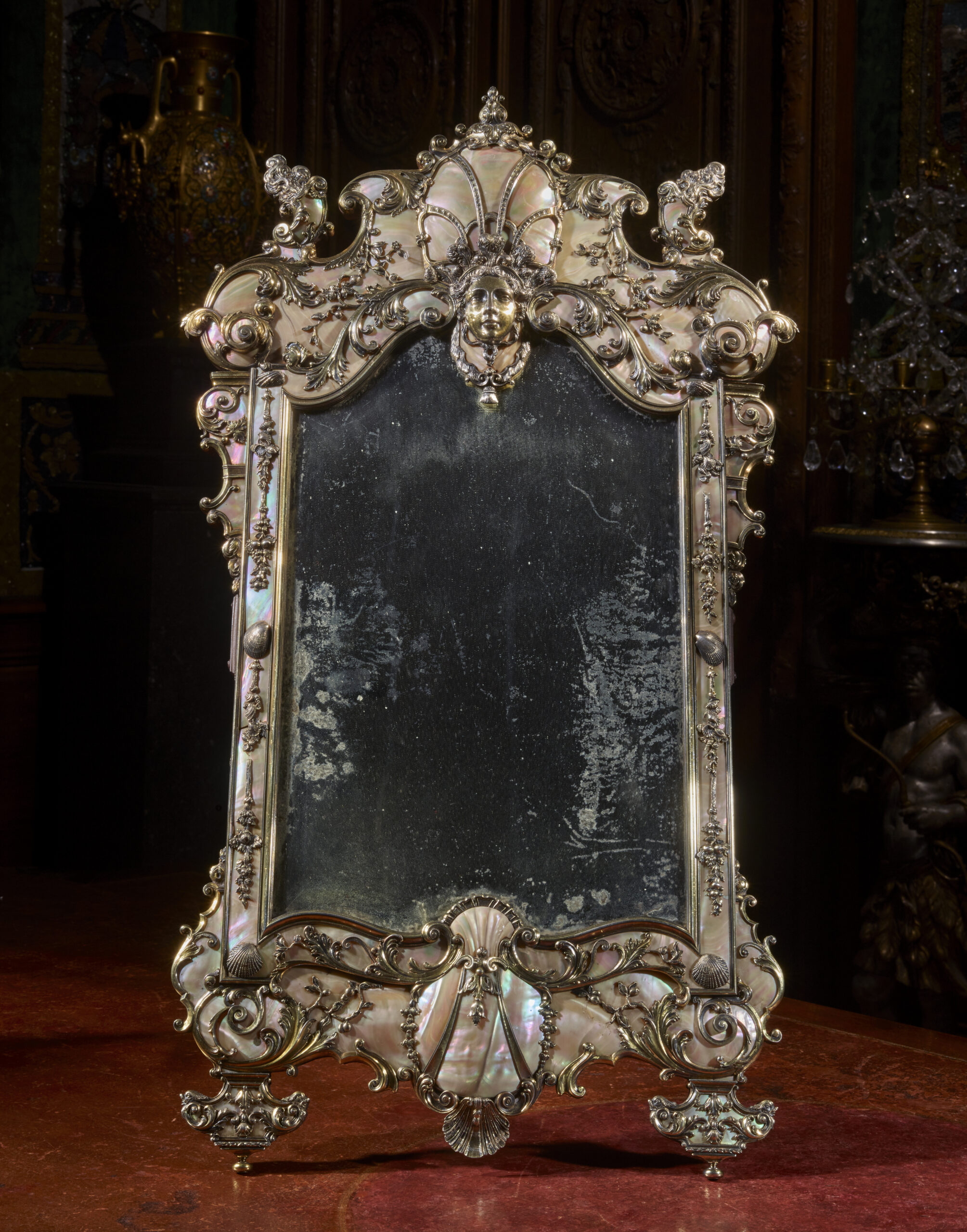 Chef d’œuvre de l’orfèvrerie anglaise à l’époque des règnes successifs de George I (1714-1727) et de son fils George II (1727-1760), ce miroir de table ou de toilette particulièrement rare et précieux, en argent doré et nacre, fut acquis en 1857 auprès du joaillier-bijoutier Rouzé, établi au n° 14 du boulevard des Italiens à Paris, par le baron Jacob Mayer de Rothschild (1792-1868), dit James de Rothschild. Il orna l’une des tables du Grand Hall du château de Ferrières, en Seine-et-Marne, bâti de 1855 à 1859 par l’architecte Joseph Paxton (1863-1865) pour le compte du baron James et de son épouse, la baronne Betty de Rothschild (1805-1886), qu’immortalisa Jean-Auguste-Dominique Ingres (1780-1867) en 1848 (ill. 10). Le miroir apparait à cet emplacement sur une aquarelle d’Eugène Lami (1800-1890), signée et datée de 1863. Il est également visible sur une photographie prise au cours de la même période, entre 1863 et 1868, appartenant à un album intitulé Château de Ferrières, regroupant 16 photographies sur papier albuminé prises d’après des négatifs sur verre au collodion, conservé à la Bibliothèque nationale de France (ill. 11).