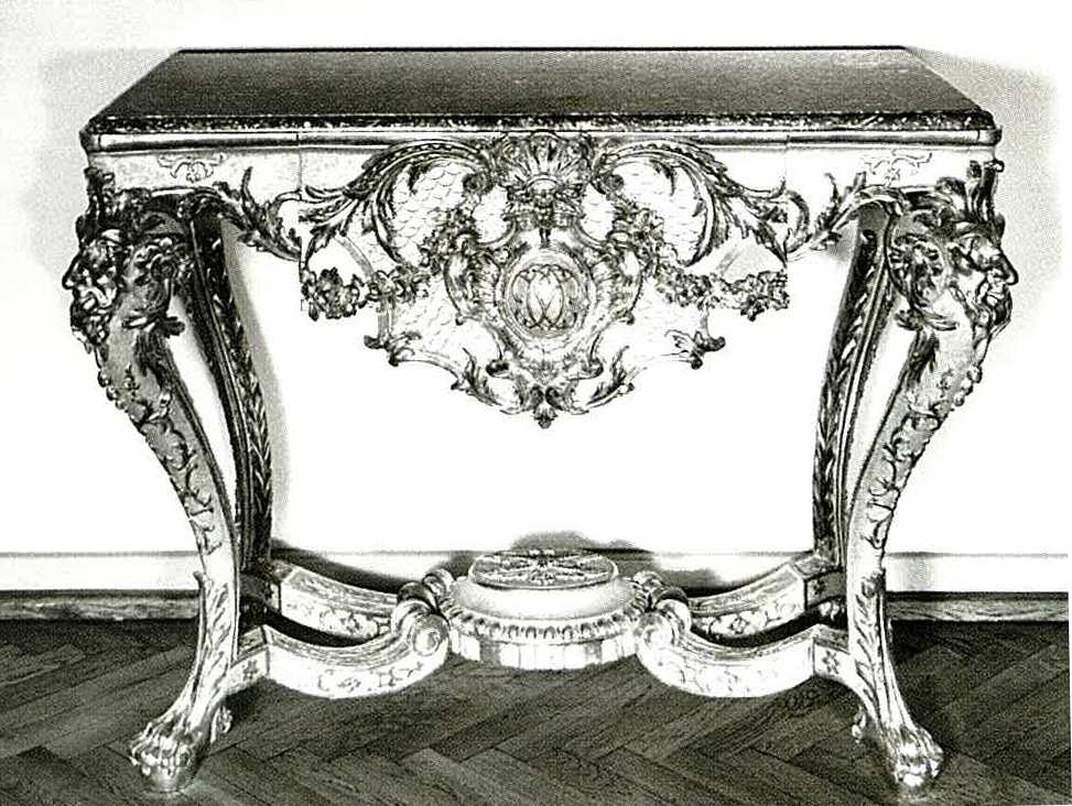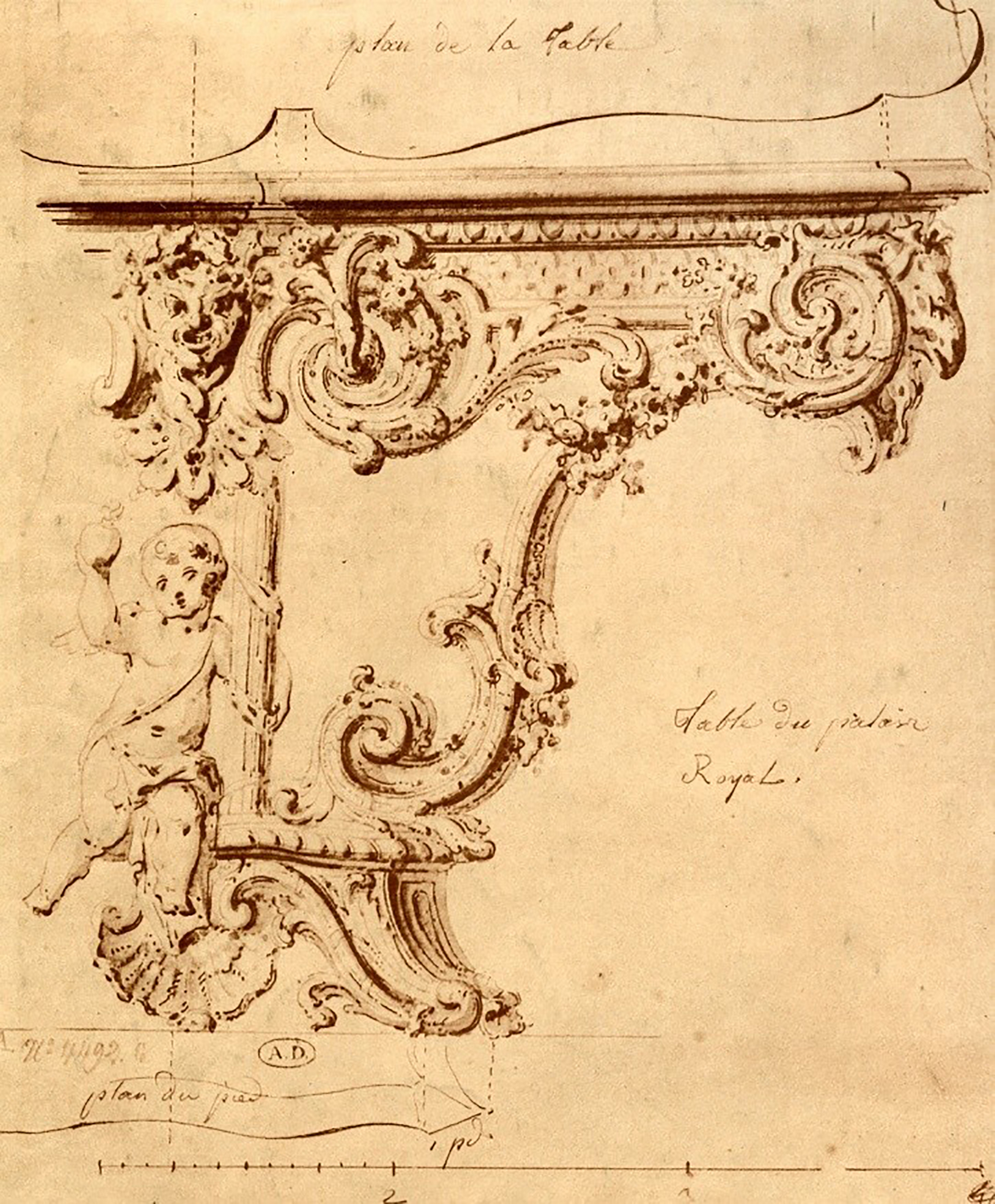 Ces consoles présentent de nombreuses analogies avec les modèles français de la période Régence. Leur dessin général n’est en effet pas étranger à celui de la console, aujourd’hui conservée au Louvre, provenant du grand cabinet du rez-de-chaussée du château de Bercy, sculptée vers 1713 par Jules Degoullons et associés pour le compte de Charles-Henri II de Malon de Bercy (1678-1742). Cette console se caractérise également par une étroite ceinture à fond mosaïqué à fleurons – un ornement très en vogue en France depuis la fin du XVIIe siècle – et une découpe inférieure très ouvragée, que l’on retrouve également par exemple sur les pieds de tables imaginés, au cours de la même période, par François Roumier. Ces modèles, encore singularisés par le respect d’une rigoureuse symétrie, furent considérés à l’époque comme une véritable innovation, et rencontrèrent un succès immédiat auprès des artisans parisiens qui contribuèrent à les propager, en particulier auprès des principautés allemandes.