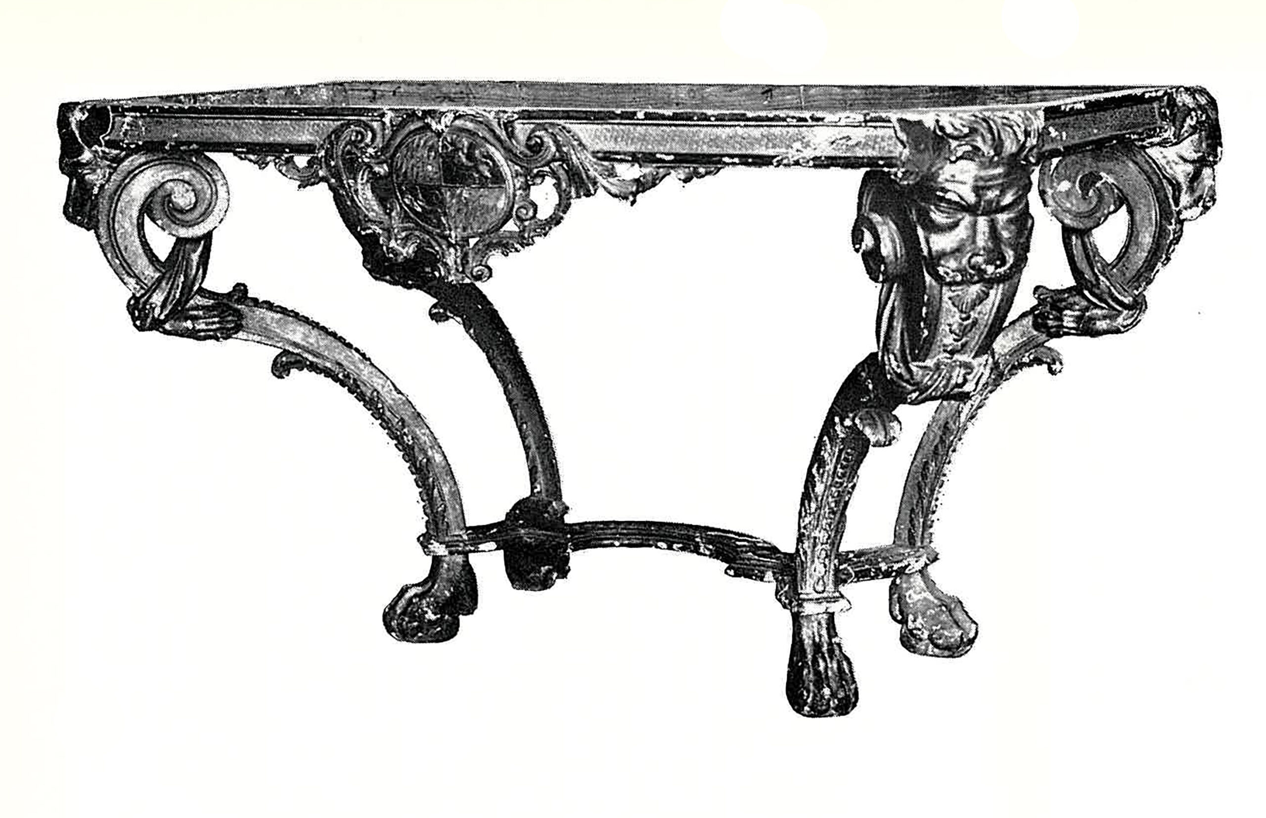 Chaque console présente une étroite ceinture légèrement mouvementée, très finement sculptée à mosaïque et rosaces, et à découpe inférieure chantournée et enrichie d’agrafes à motifs d’acanthes. Au large cartouche central monogrammé évoqué ci-dessus, flanqué de volutes à enroulements fleuronnées d’acanthes, répondent les deux imposants mufles de lion des angles. Disposés en diagonale, ces derniers, ‘coiffés’ de culots d’acanthes et de fleurons et soulignés de pattes de lion nouées, couronnent deux pieds en console, de section carrée et moulurée, à courbe et contrecourbe imbriquées, rehaussés de larges feuilles d’acanthes et de chutes de fleurons. Ces pieds sont joints, juste au-dessus des pieds-griffes feuillagés d’acanthes supportant la console, au moyen d’une entretoise, sculptée à motifs de frises feuillagées, formant un arc central, souligné d’une opulente coquille festonnée, et surmonté d’une large palmette fleuronnée et perlée. Un plateau de marbre Sarrancolin mouluré à ‘bec de corbin’ couronne l’ensemble.