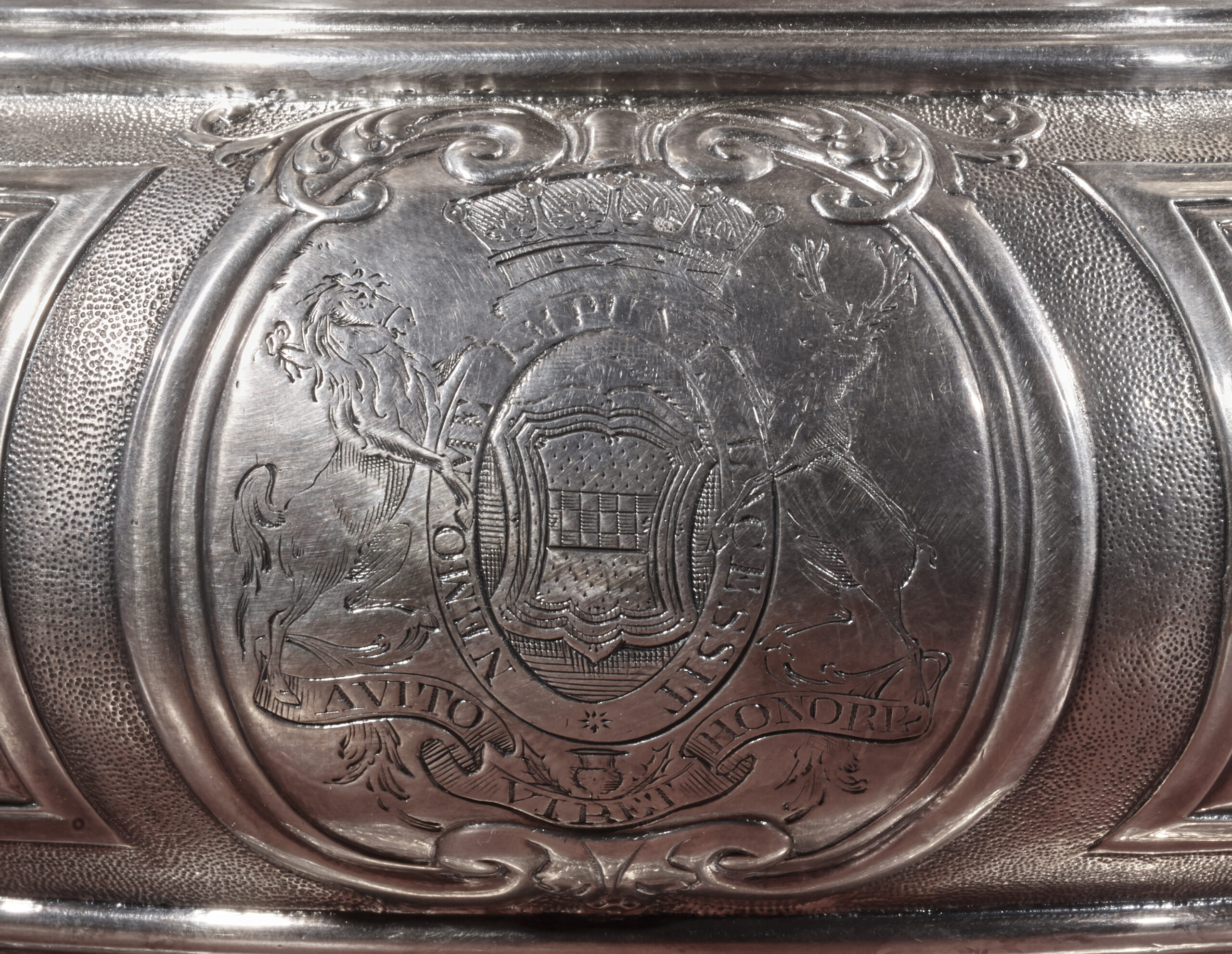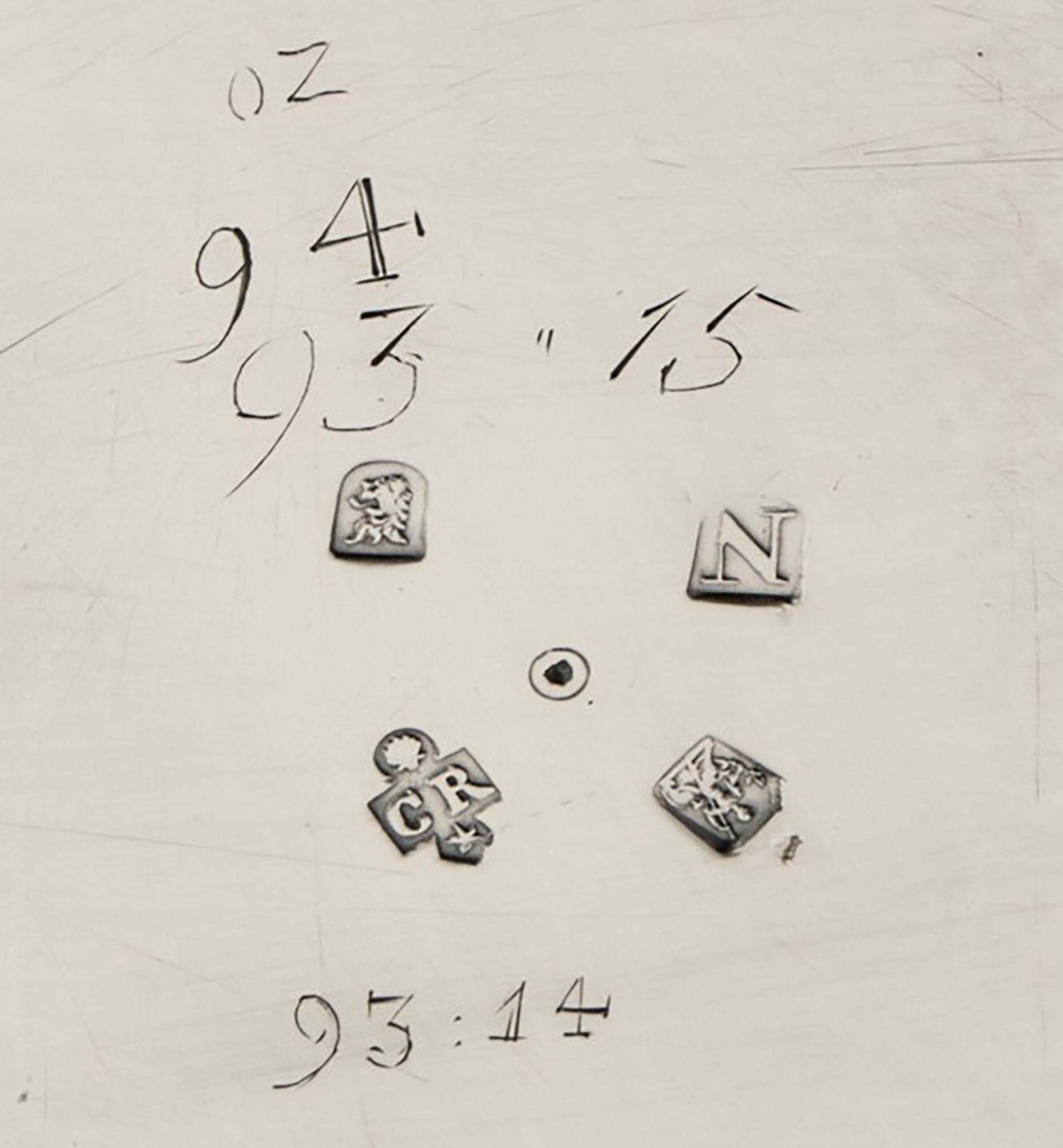 POINÇONS : poinçon de maître de Paul Crespin (lettres CR surmontées d’une coquille et soulignées d’une étoile) (entre 1720 et 1739, le poinçon de maître devait être composé des deux premières lettres du nom de famille de l’orfèvre pour les objets fabriqués aux normes du « Britannia Standard », et des initiales du prénom et du nom pour les objets fabriqués en argent massif); poinçon du « Britannia Standard », poinçon de référence pour un titre d’argent de 95,84 % (obligatoire depuis 1697) ; tête de lion arasée, poinçon de la ville de Londres relatif au « Britannia Standard » ; N, lettre date de la ville de Londres désignant la période 1728-1729 (London Assay Office Letters / Cycle 13 / George I et II).
