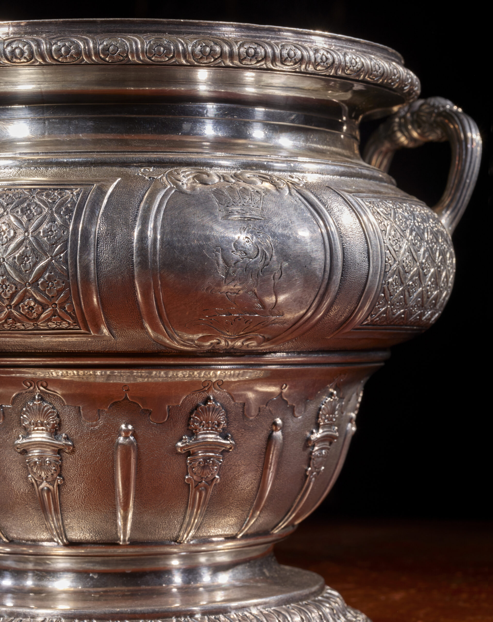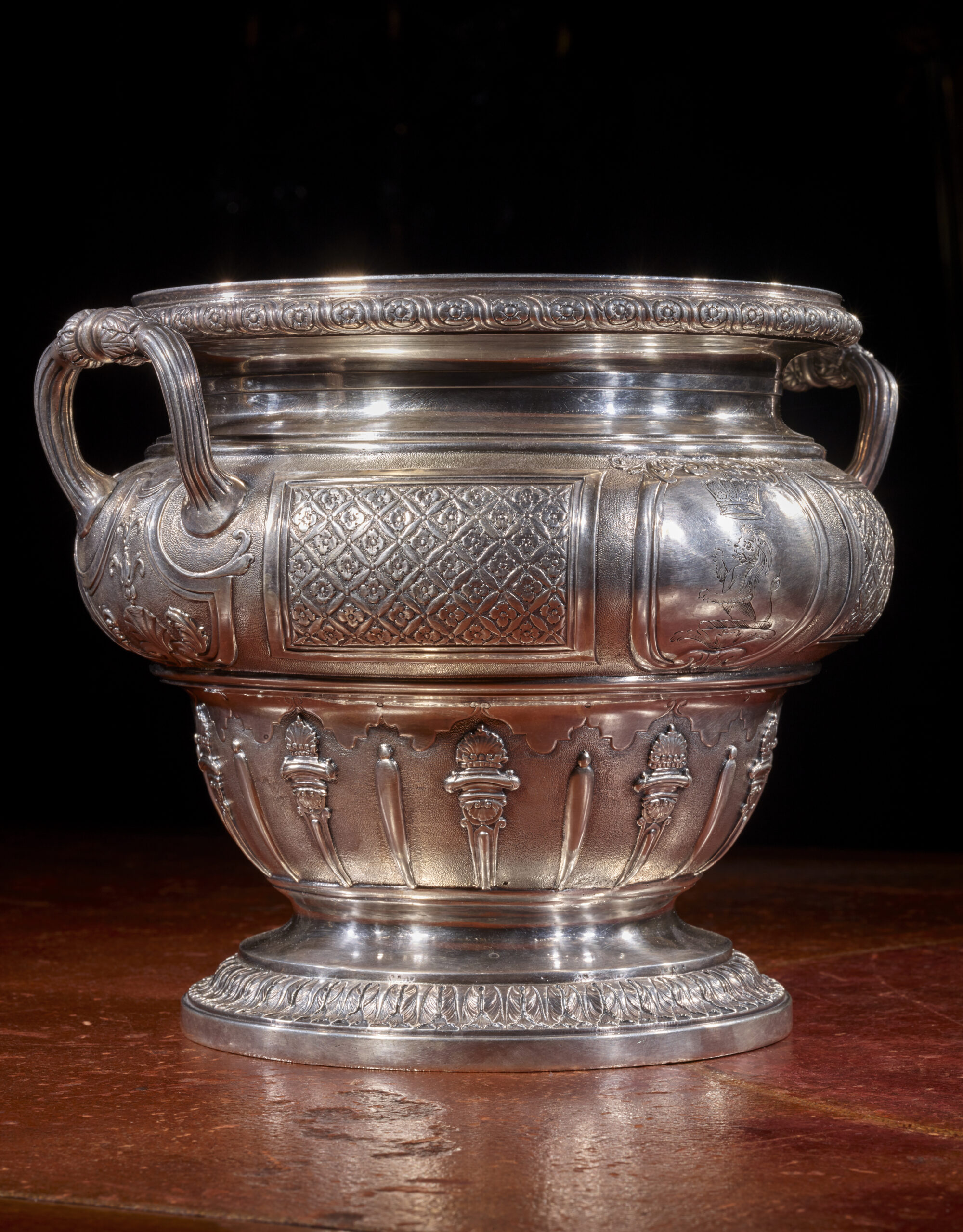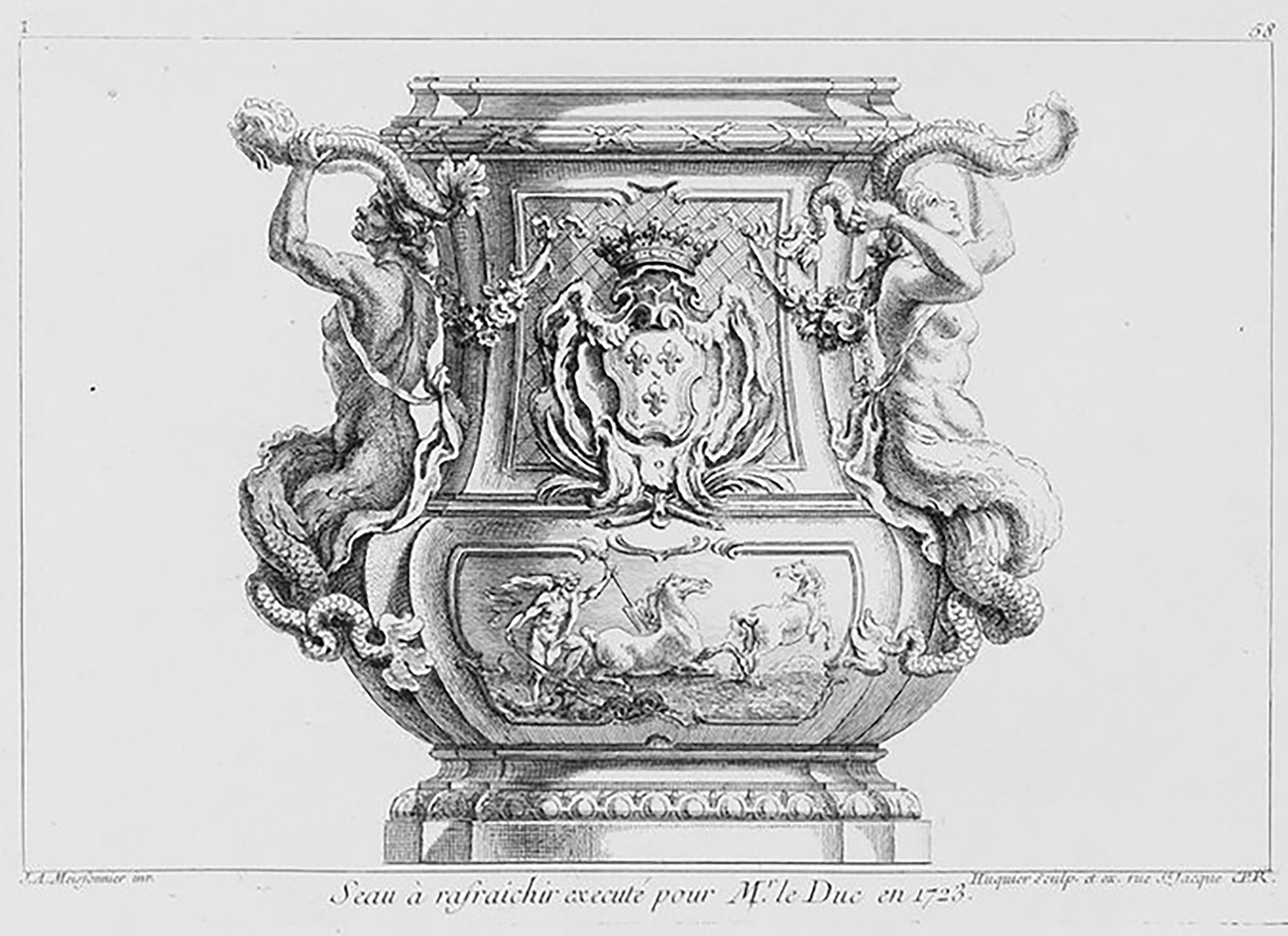 A titre d’exemple, la paire de seaux à rafraîchir en argent aux armes des Spencer-Churchill accolées à celles des Trevor, exécutée par Paul Crespin en 1733, très certainement à l’occasion du mariage de Charles Spencer-Churchill, 3e duc de Marlborough et d’Elizabeth, fille de Thomas Trevor, 2e baron Trevor de Bromham, puise directement sa source dans le modèle d’un seau à rafraîchir réalisé en 1723 par Juste-Aurèle Meissonnier (1695-1750) pour le duc d’Orléans à Paris, un modèle qui fut gravé par Gabriel Huquier (1695-1772) et publié dans le Neuvieme livre des Œuvres de J. A. Meissonnier. Ce style usa de formes d’inspiration classique décorées d’ornements non pas repoussés mais moulés, singularisés en particulier par d’étroits feuillages ou ‘bandes’ verticales disposés en applique au niveau de la base des vases, motifs connus en Angleterre sous le nom de cut card work. Très prisé des orfèvres huguenots, mais également anglais, ce style perdura jusqu’en 1740 environ, côtoyant, à cette époque, le style rococo qui participa également à la renommée de Paul Crespin.