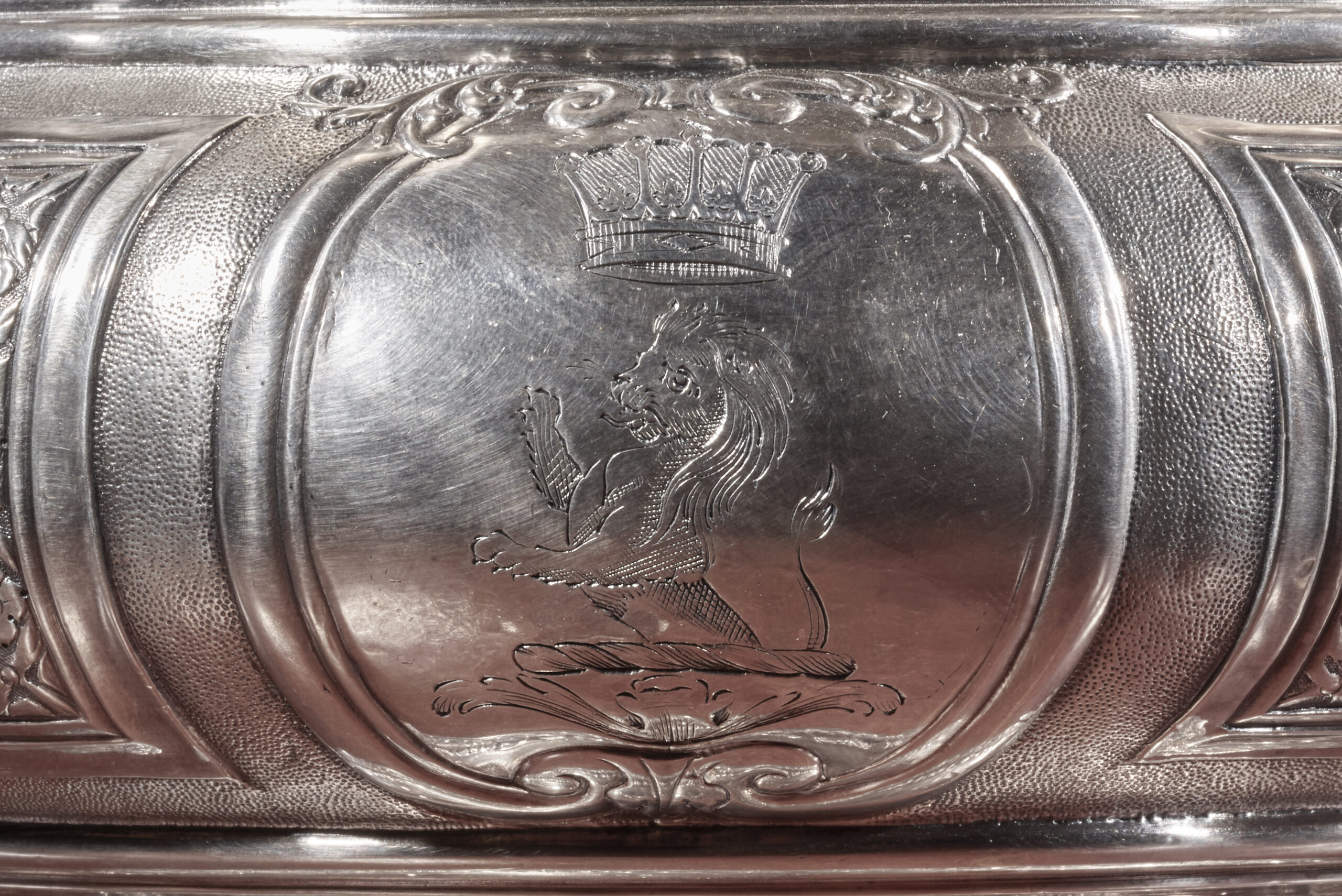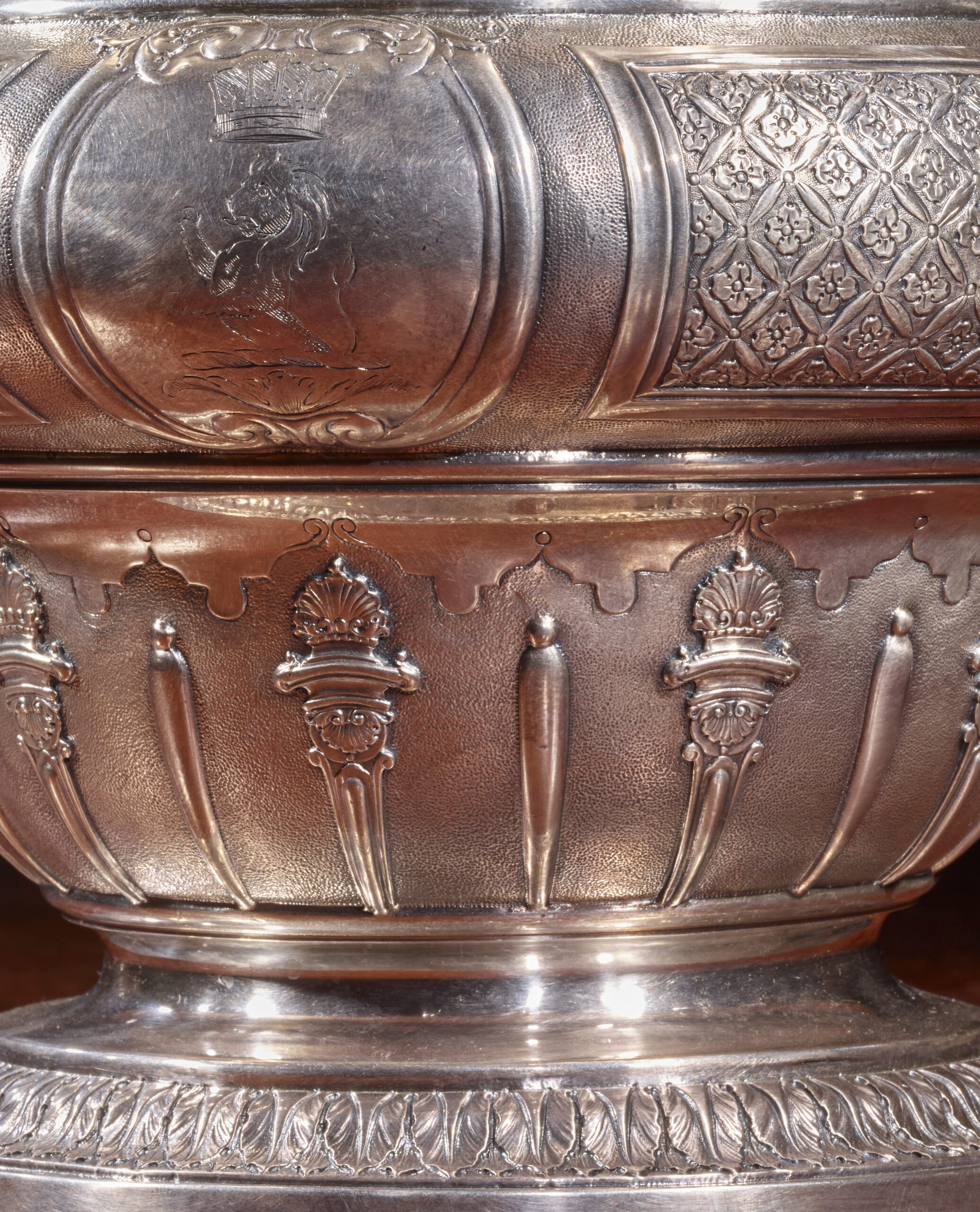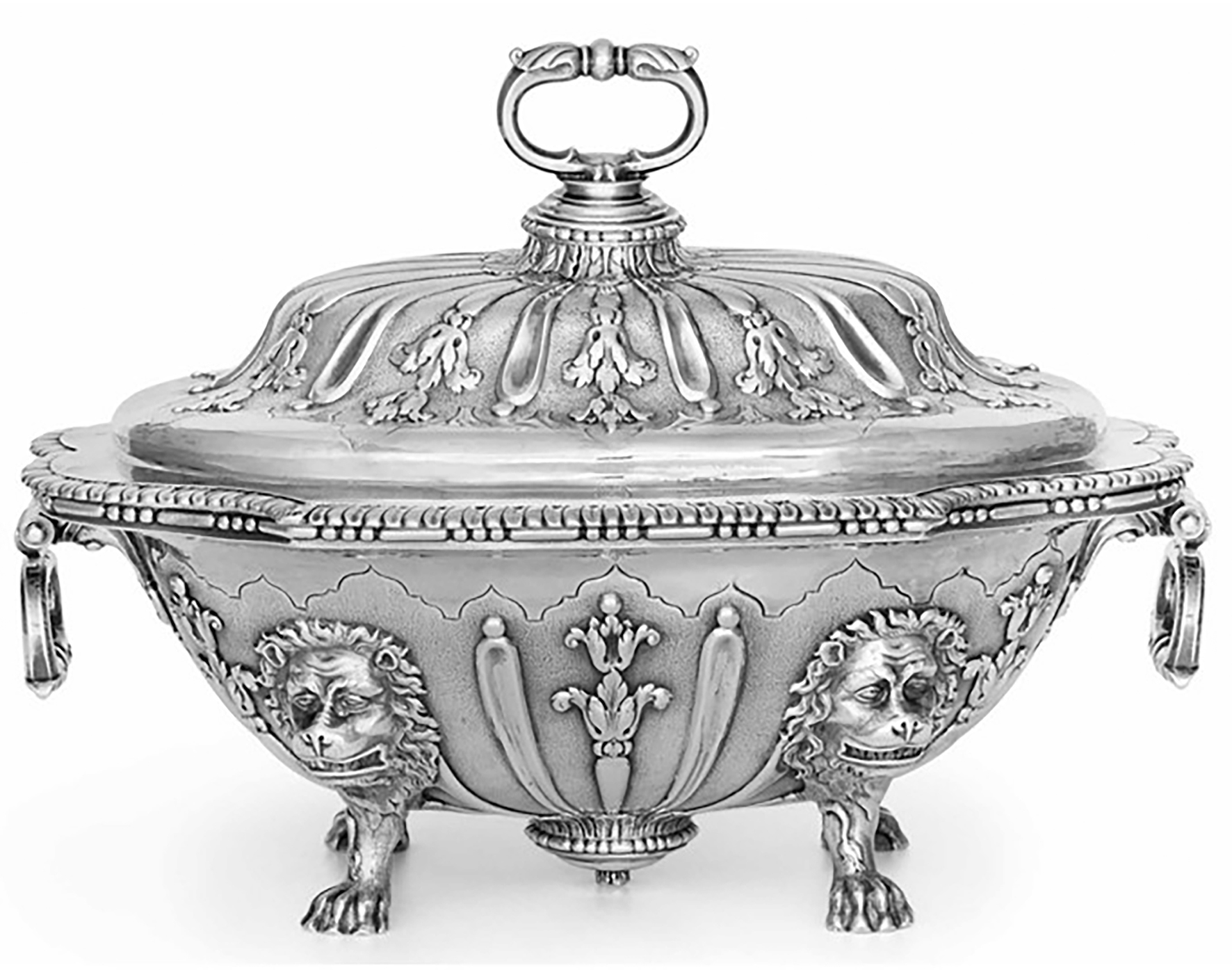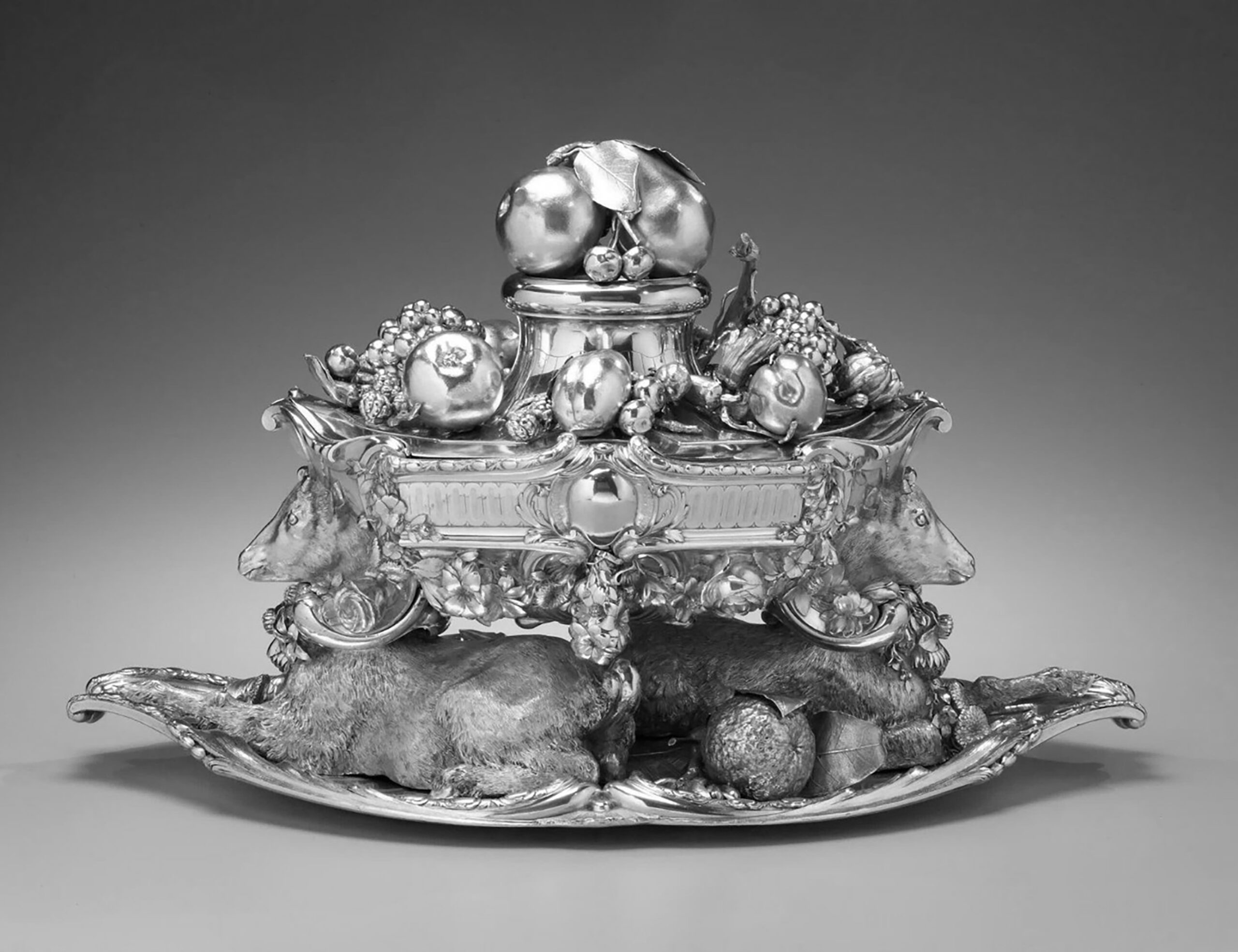 A titre d’exemple, la paire de seaux à rafraîchir en argent aux armes des Spencer-Churchill accolées à celles des Trevor, exécutée par Paul Crespin en 1733, très certainement à l’occasion du mariage de Charles Spencer-Churchill, 3e duc de Marlborough et d’Elizabeth, fille de Thomas Trevor, 2e baron Trevor de Bromham, puise directement sa source dans le modèle d’un seau à rafraîchir réalisé en 1723 par Juste-Aurèle Meissonnier (1695-1750) pour le duc d’Orléans à Paris, un modèle qui fut gravé par Gabriel Huquier (1695-1772) et publié dans le Neuvieme livre des Œuvres de J. A. Meissonnier. Ce style usa de formes d’inspiration classique décorées d’ornements non pas repoussés mais moulés, singularisés en particulier par d’étroits feuillages ou ‘bandes’ verticales disposés en applique au niveau de la base des vases, motifs connus en Angleterre sous le nom de cut card work. Très prisé des orfèvres huguenots, mais également anglais, ce style perdura jusqu’en 1740 environ, côtoyant, à cette époque, le style rococo qui participa également à la renommée de Paul Crespin.