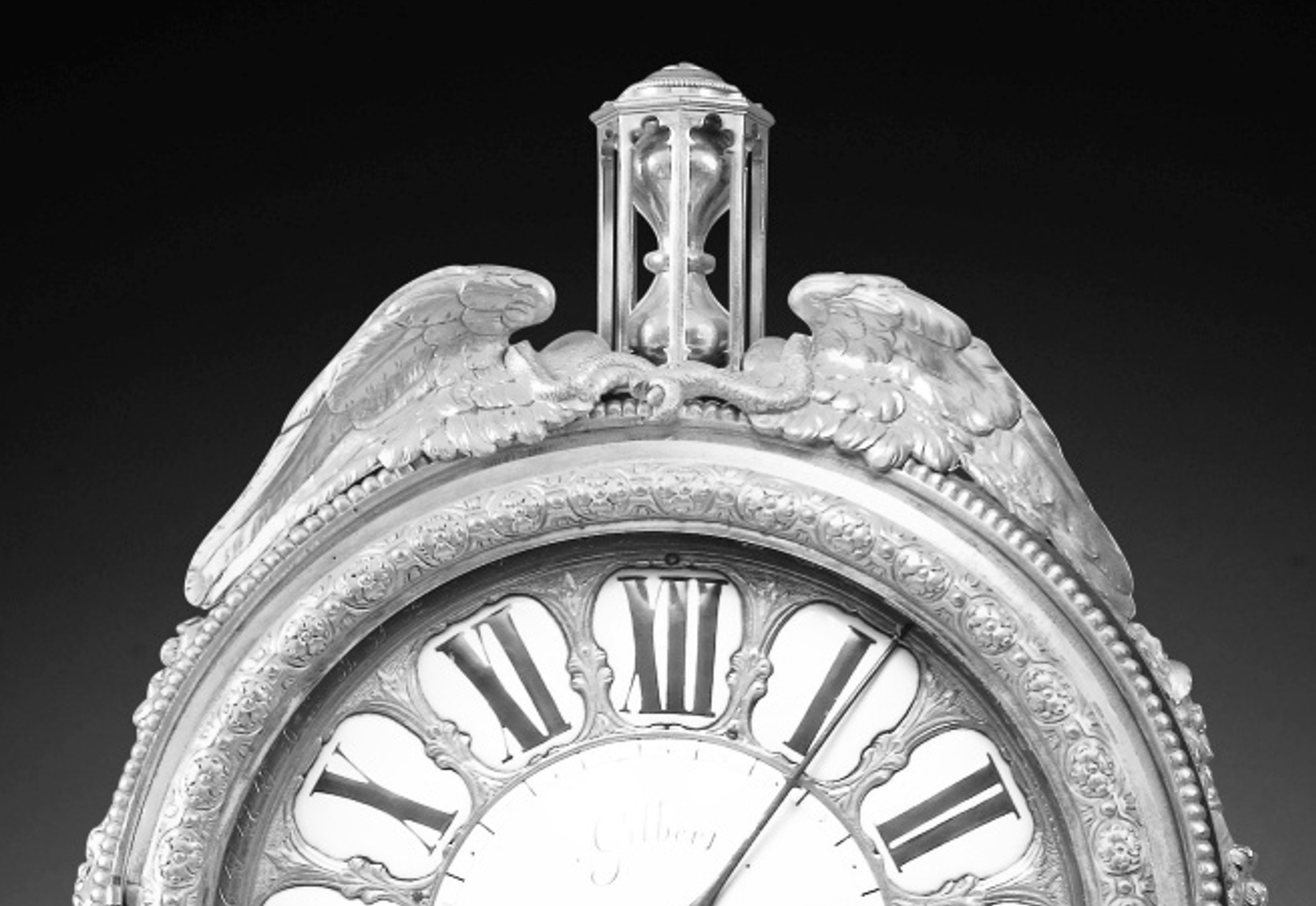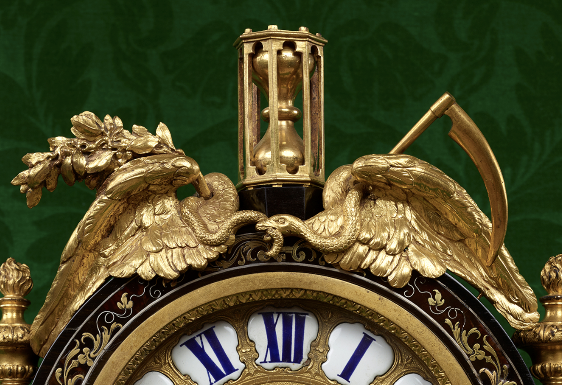 Détail du couronnement d’un exemplaire de la pendule dite du Jour et de la Nuit, par André-Charles Boulle, le cadran et le mouvement sont ici signés Gilbert /A Paris, ancienne collection d’Etienne Perrinet de Jars (1670-1762).
