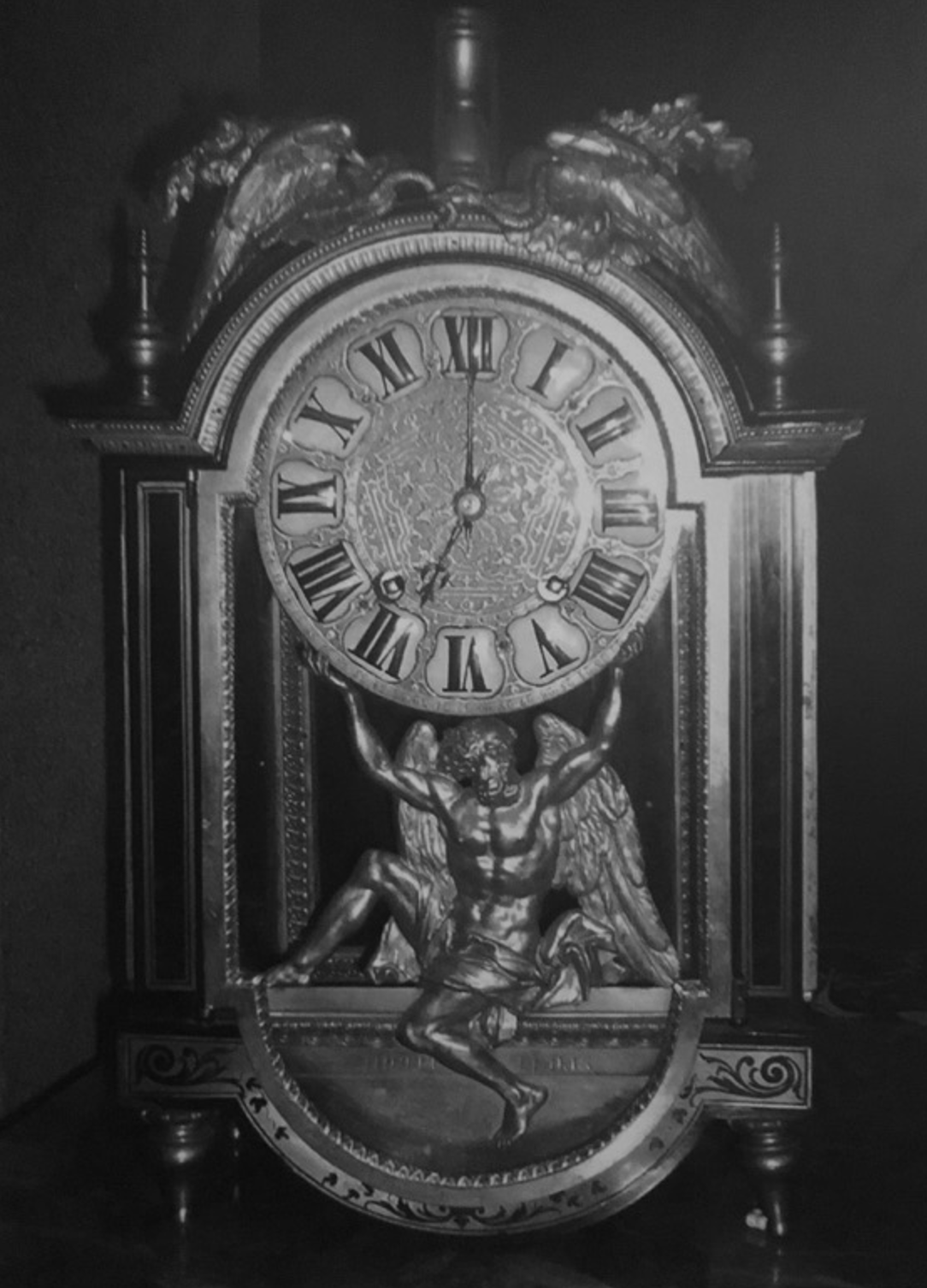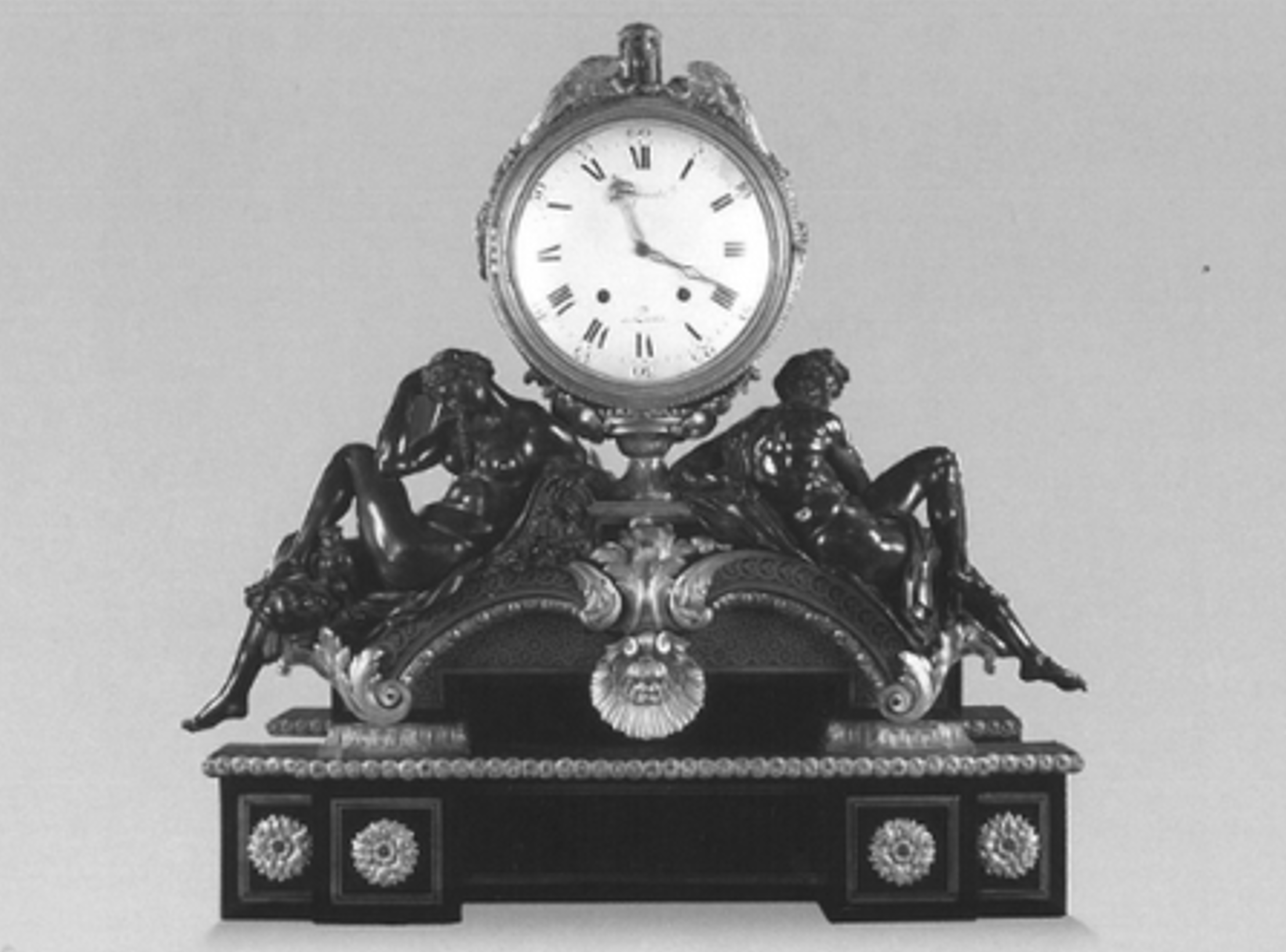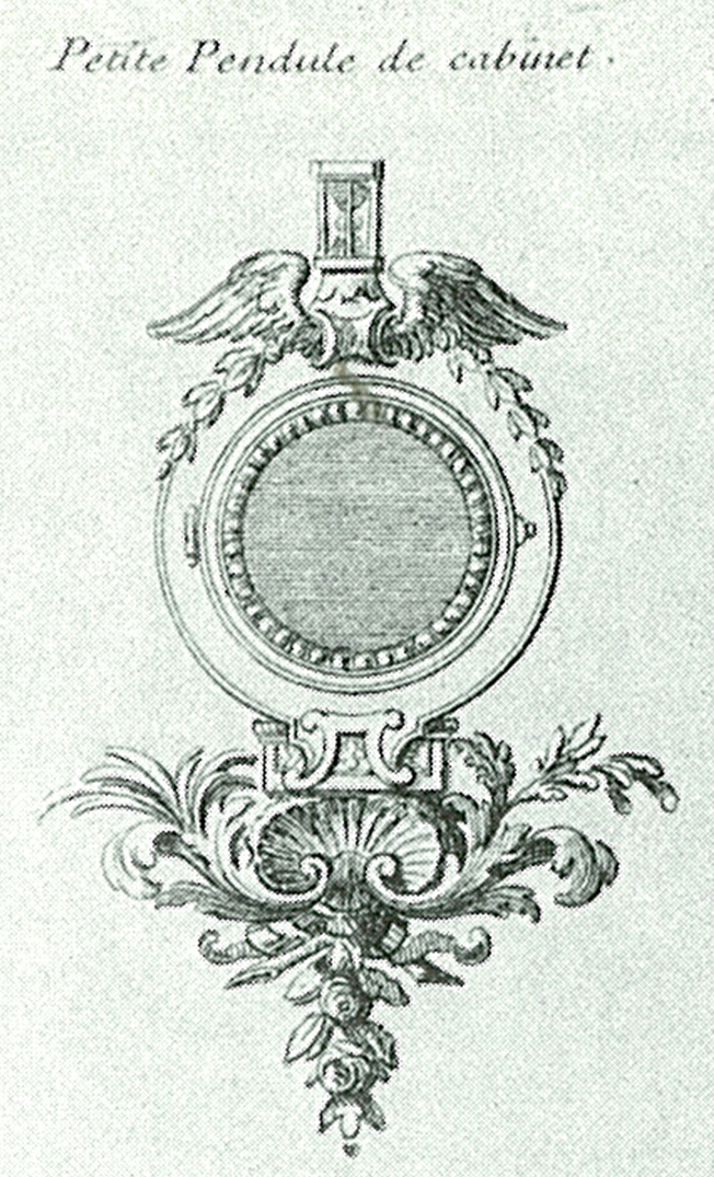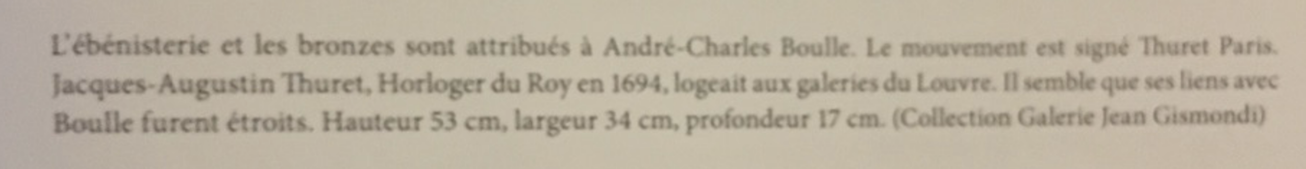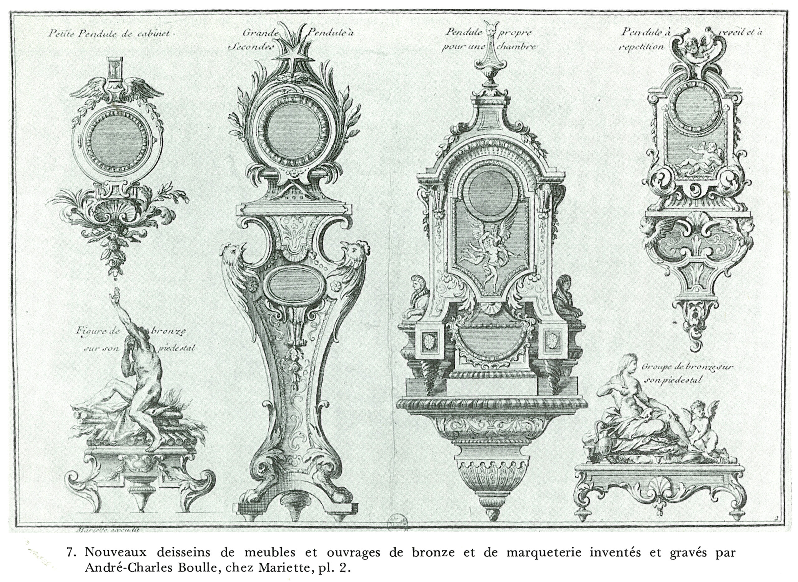 On retrouve plusieurs éléments décoratifs de notre pendule dans la planche 2 de l’ouvrage publié par Boulle avec la collaboration de Pierre Mariette en 1707 Nouveaux Deisseins de Meubles et Ouvrages de Bronze et de Marqueterie : le petit sablier au sommet de la « Petite Pendule de cabinet », la position des jambes du Chronos assis de « Figure de bronze sur son piédestal » et la forme générale de la « Pendule propre pour une chambre » proche de la nôtre. On remarque également le petit sablier couronnant la pendule dite du Jour et de la Nuit, autre pendule d’André-Charles Boulle, dont un exemplaire reproduit ci-dessous, orné d’un mouvement de Lepaute et provenant de la collection des prince de Condé, est aujourd’hui conservée à l’hôtel de Soubise à Paris.