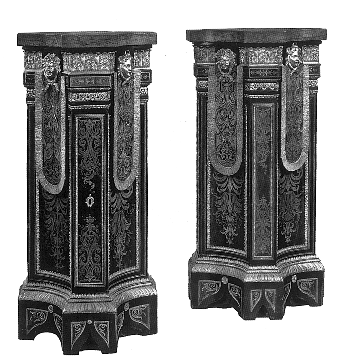 Placage d’ébène ; marqueterie en ‘première partie’ de laiton et d’étain sur fond d’écaille et d’ébène; corne teintée bleue ; bronze doré ; émail.