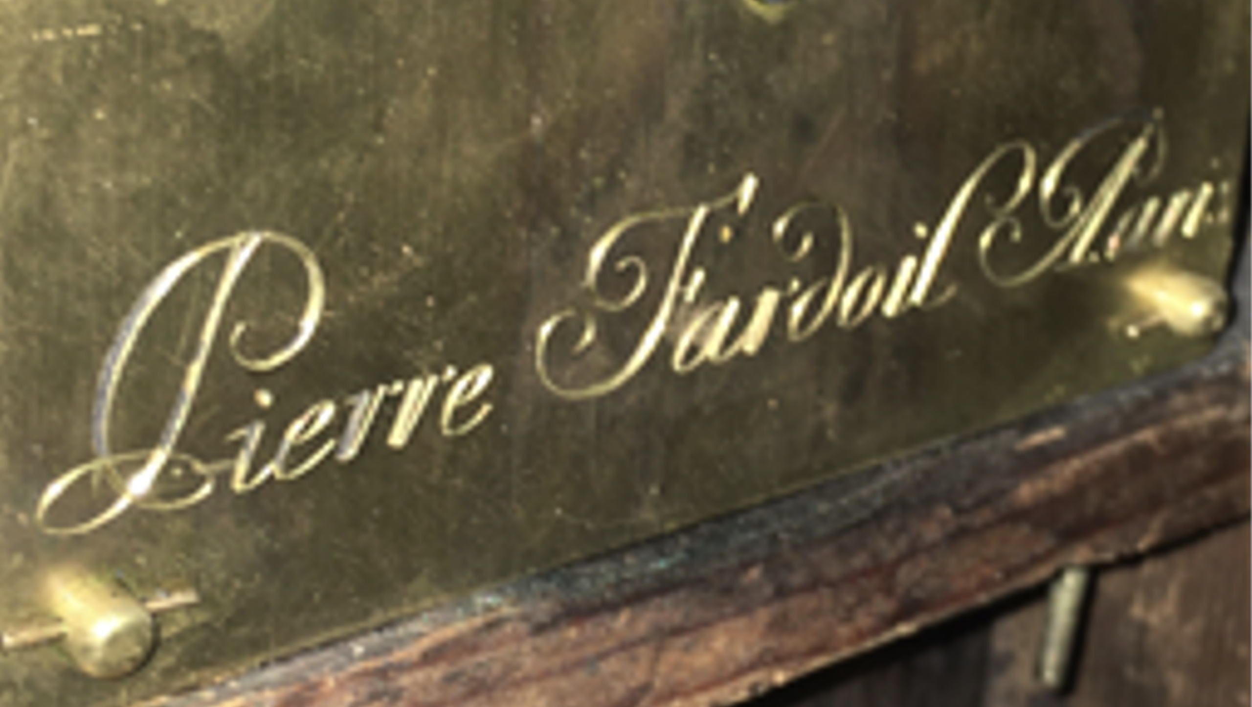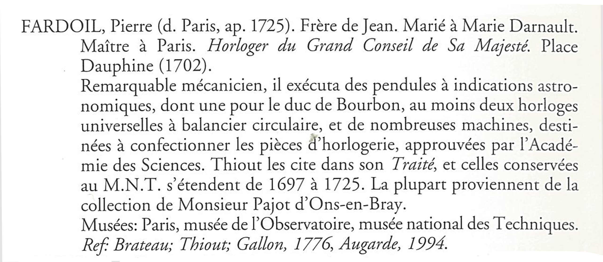 Les Fardoil étaient une dynastie d’horlogers réputés. Pierre Fardoil était l’un des fils de Pierre Fardoil père, seigneur de Blois, décédé en 1669 et de sa femme Françoise Bouillon. Pierre Fardoil fils devint maître horloger en 1684. Il épousa Marie Darnault le 29 octobre 1685 à l’église Saint-Honoré de Blois. Il était huguenot et avait fui la France pour Londres en raison des persécutions religieuses après la révocation de l’édit de Nantes en 1685 ; il y travaillait sous le nom de Peter Fardoil. Vers 1700, Fardoil revint en France et installa son atelier sur la place Dauphine à Paris en tant que « maître horloger du Grand Conseil du Roy ».