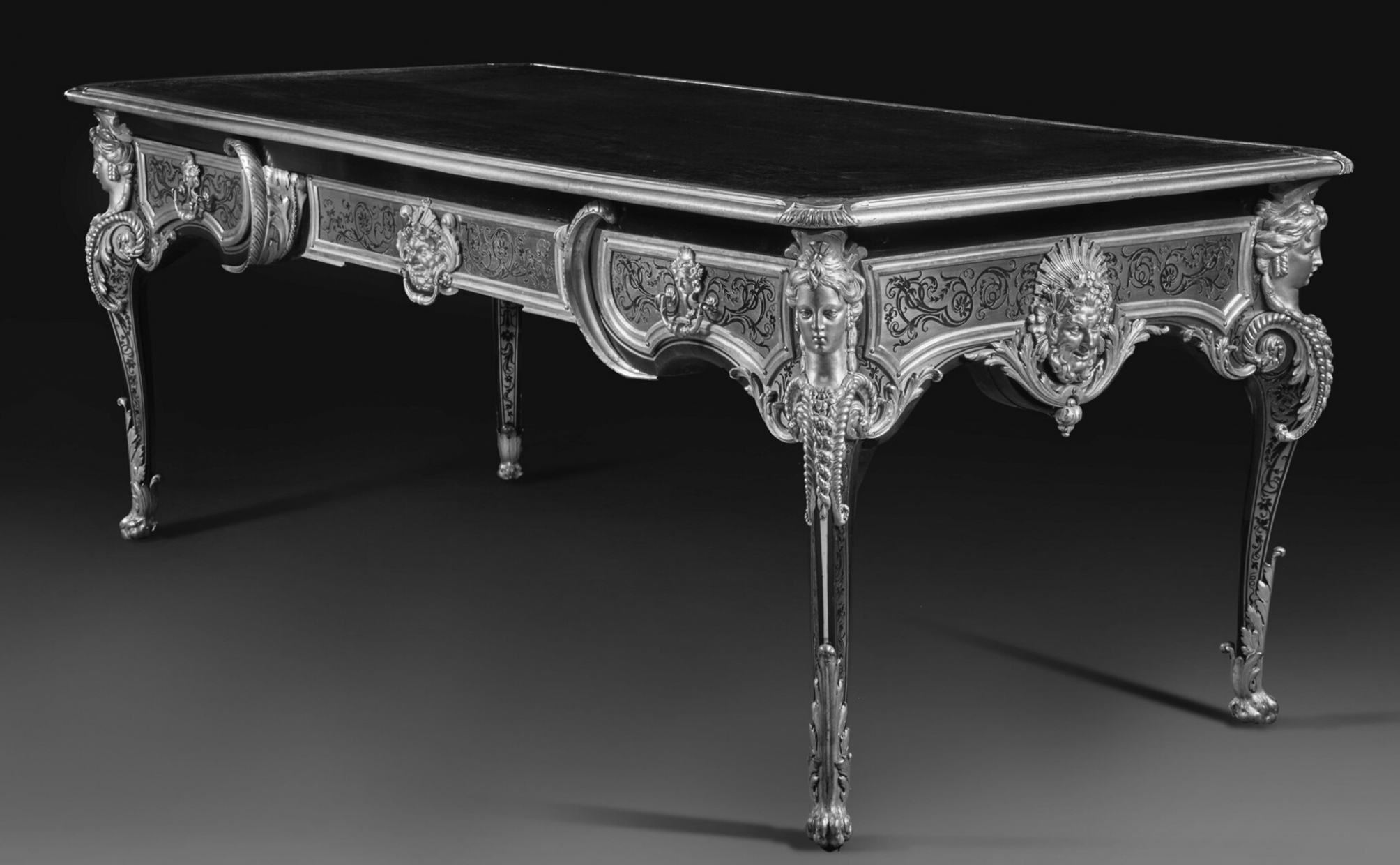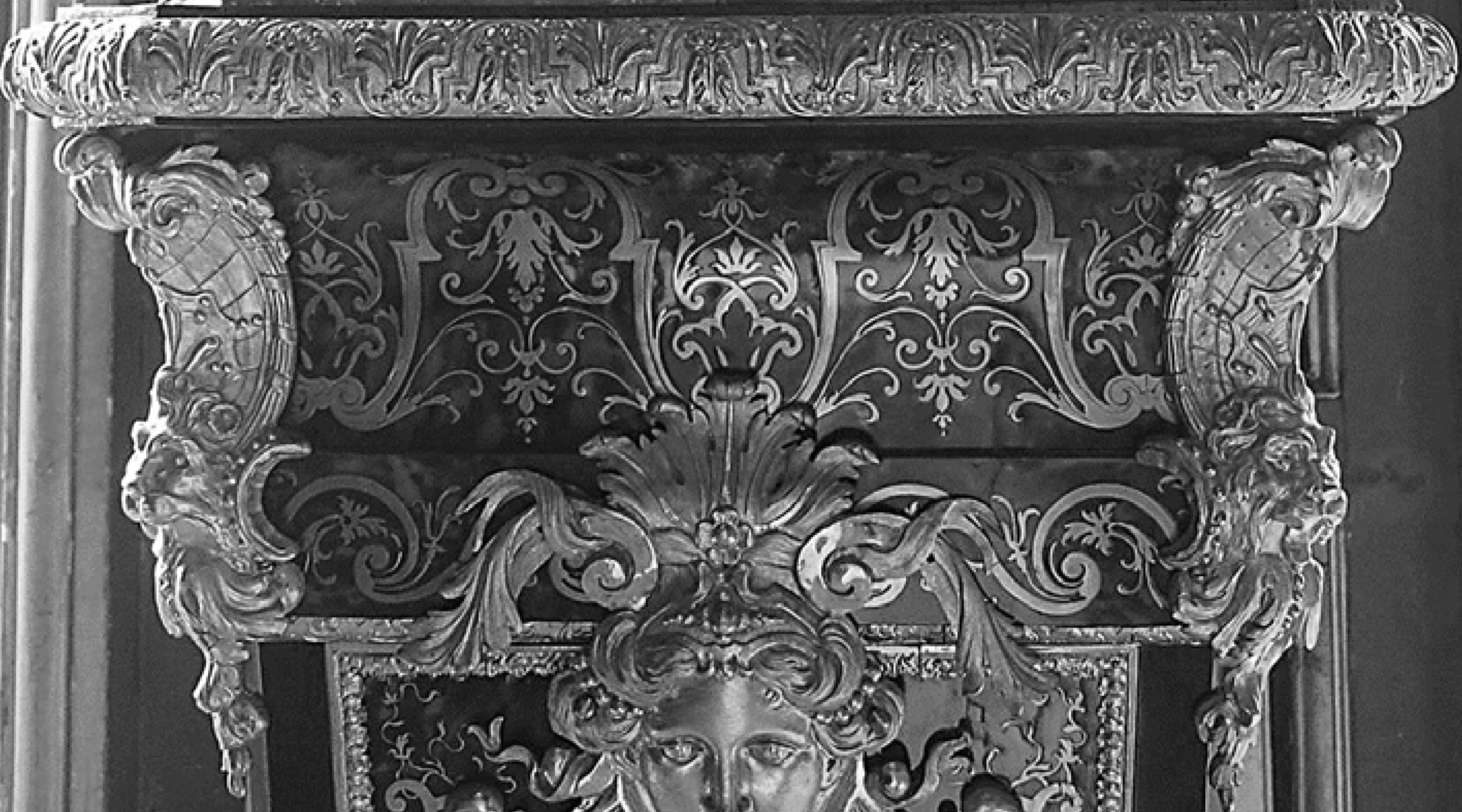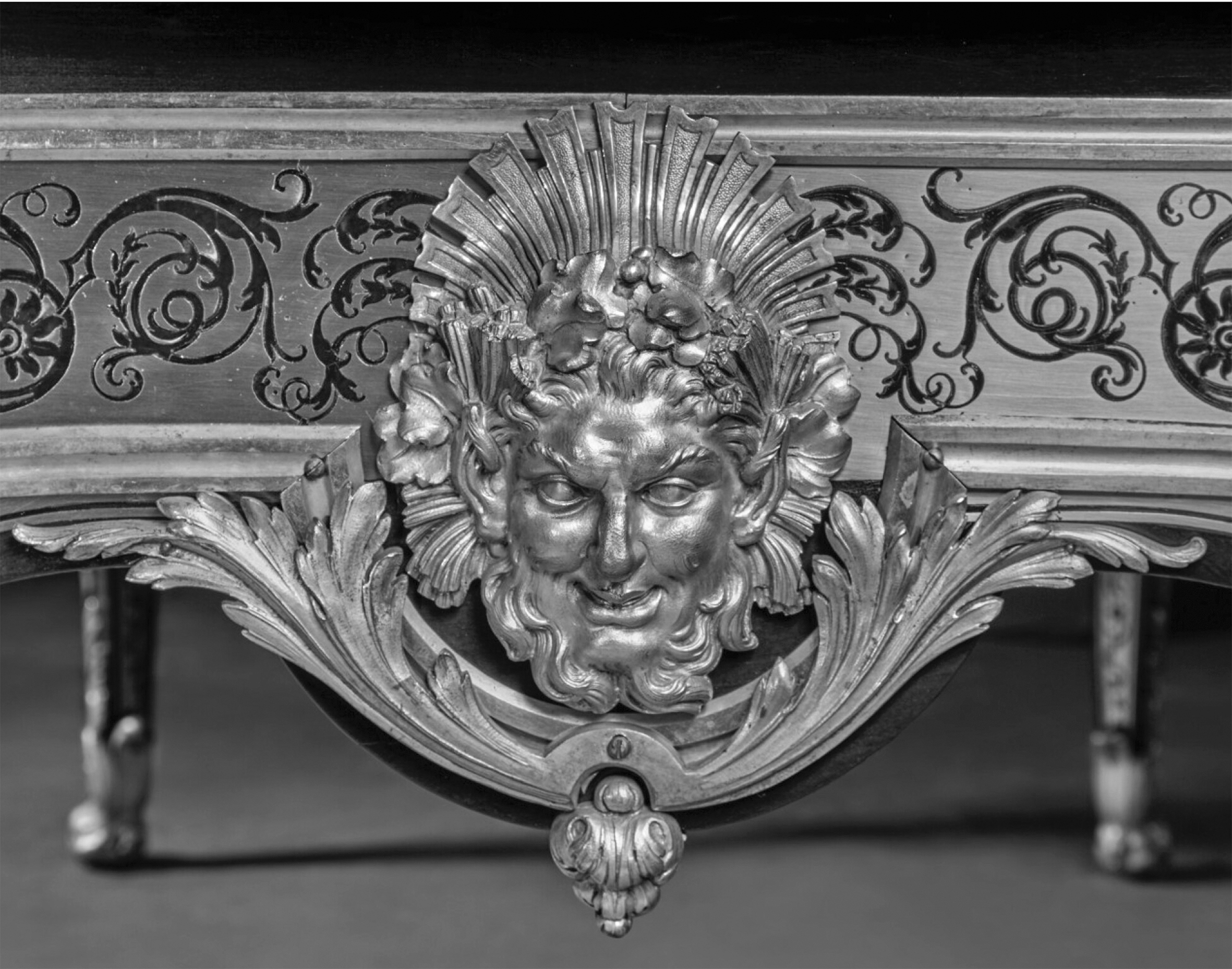 Ce décor se poursuit sur la gaine évasée de la pendule, dont la forme évoque celle visible sur un rarissime dessin à l’encre noire et lavis sur papier, à taille d’exécution, daté vers 1710-1715, attribué à Alexandre-Jean Oppenordt (1639-1715), très certainement exécuté à l’intention de Frédéric-Auguste Ier de Saxe (1670-1733), dit « Auguste le Fort », prince-électeur de Saxe et roi de Pologne, et conservé au Kupferstichkabinett de Dresde (inv. C 6724). Cette gaine, au même titre que la pendule qu’elle supporte, présente un très riche décor de bronze, dont un masque de faune ou de satyre souriant, coiffé d’une palmette stylisée à motifs de canaux, qui appartient aux modèles d’André-Charles Boulle. On le retrouve en effet ornant le centre des petits côtés de plusieurs bureaux plats du maître, à l’image de celui commandité en 1715 par Louis IV Henri de Bourbon-Condé (1692-1740), 7e prince de Condé, pour son château de Chantilly, aujourd’hui conservé au château de Versailles (in. VMB 960) et aussi sur le bureau qu’il réalisa pour Jean Baptiste de Machault d’Arnouville, comte d’Arnouville (1701-1794), contrôleur général des finances de Louis XV (1745-1754), puis secrétaire d’État de la Marine (1754) et garde des sceaux de France (1750) (ill. 3&4). Les chutes à masques de lion surmontés d’un cartouche mosaiqués flanqués de faisceaux enrubannés et rehaussés d’une palmette godronnée en ‘aile de chauve-souris’, sont exactement les mêmes que celles ornant la gaines de la pendule dite « du char d’Apollon », exécutée avant 1715 également pour les princes de Condé au château de Chantilly, longtemps attribuée à Boulle et à ses fils, mais réattribuée depuis, par Calin Demetrescu, à Alexandre-Jean Oppenordt. Cette pendule extraordinaire, au mouvement signé comme ici Mynuel à Paris, appartient aujourd’hui aux collections du château de Fontainebleau (inv. F 829c) (ill. 5&6). L’emploi de ces bronzes, caractéristiques de l’œuvre de Boulle et de ses fils, semblent bel et bien attester une collaboration entre l’atelier de ces derniers et celui de Cressent. Et si le modèle des chutes de notre gaine peut être attribué à Oppenordt, celui-ci étant mort depuis 1715, il est tout-à-fait possible qu’il ait continué à être exploité par Boulle fils, puis par Cressent, la collaboration entre André-Charles Boulle et Alexandre-Jean Openordt ayant été indéniable pour reprendre le terme de Calin Demetrescu.