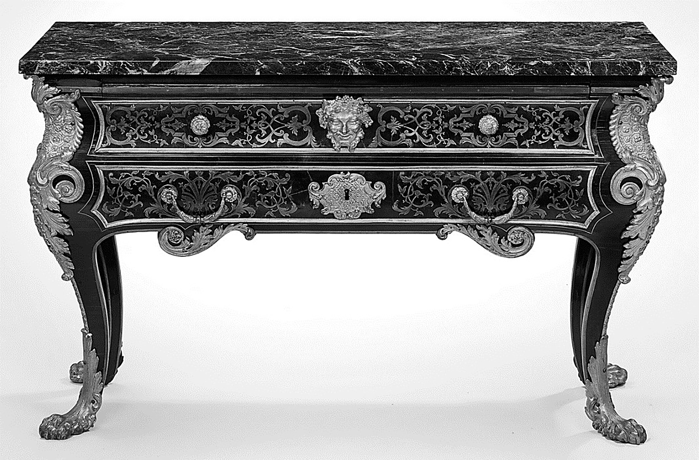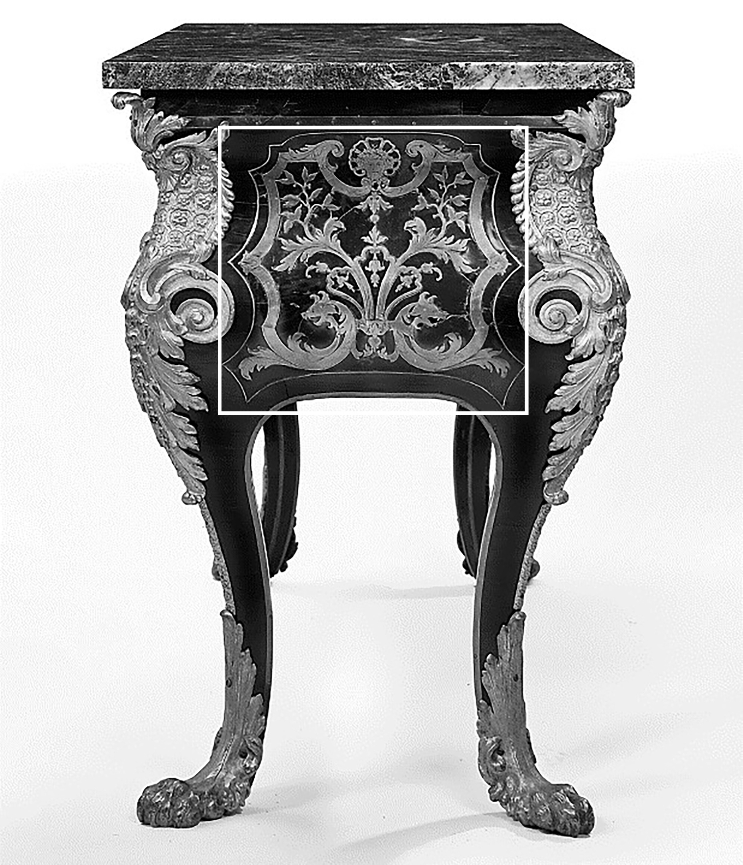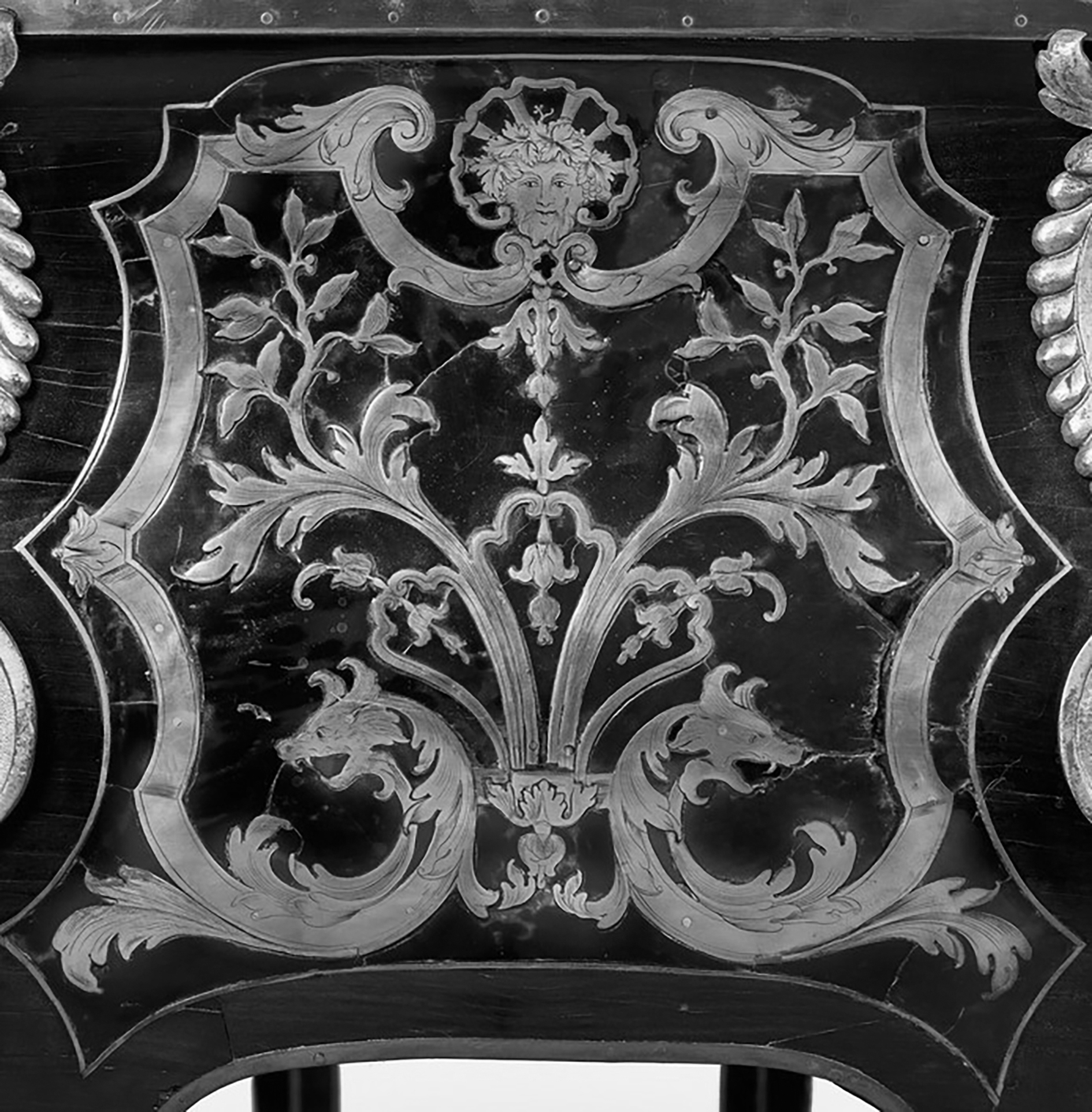 Cette hypothèse est ici totalement confirmée par le panneau marqueté en ‘contre-partie’ ornant l’intérieur du vantail postérieur de notre pendule, à bordures en forme de jeux de bandes polylobées, ponctuées d’un masque bachique auréolé, et terminées au niveau des enroulements inférieurs par de singulières têtes de loup ou de chien, entre lesquelles s’élancent deux branches feuillagées au naturel flanquant une chutes de fleurons (ill. 7). Ce panneau correspond exactement à ceux exécutés en ‘première partie’ décorant les petits côtés d’une commode à deux rangs de tiroirs unanimement attribuée à Joseph Poitou et provenant de la collection Hubert de Givenchy (1927-2018) (ill. 8&9). Une variante de ce modèle de commode, mais plaquée en amarante, est conservée à New York, au Metropolitan Museum of Art, vendue au musée en 1925 par Seligmann, Rey & Co. (inv. 25.160). Le décor marqueté à fond de laiton, incluant des incrustations de nacre, d’étain et de corne polychrome de notre pendule et de sa gaine, forme de surcroît ici le seul exemple connu de ce type de décor en ‘contrepartie’ polychrome répertorié dans la production aujourd’hui identifiée de Joseph Poitou.