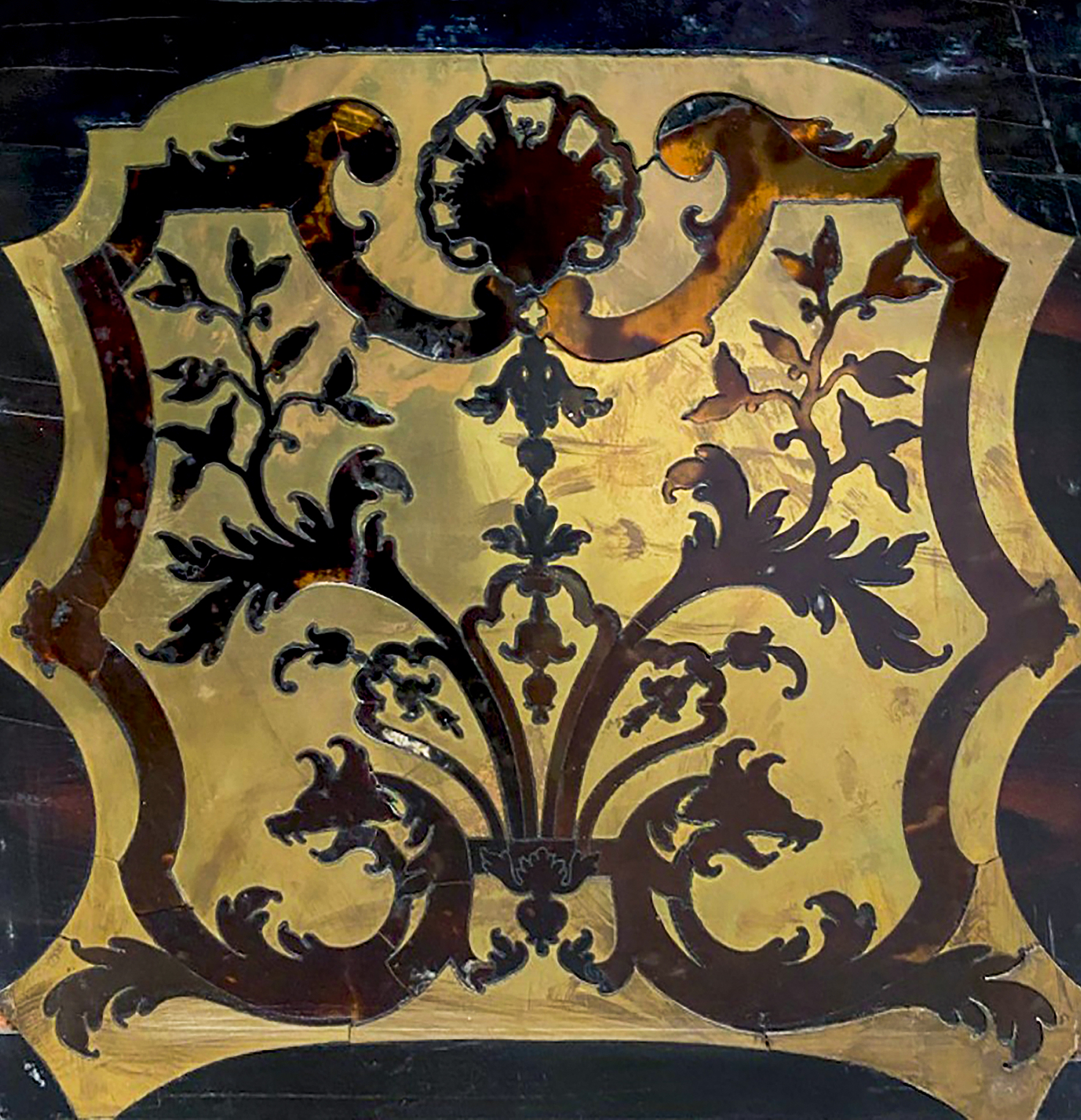 Si la pendule du Metropolitan Museum of Art et celle mentionnée par Calin Demetrescu montrent toutes deux un décor en ‘première partie’ de marqueterie de cuivre sur un fond d’écaille brune, le tout dans des encadrements plaqués en ébène, le décor en ‘contre-partie’ de la pendule des princes Borghese apparait en revanche beaucoup plus riche, réhaussé par des inclusions de nacre montrant en particulier des papillons, d’étain et de papiers polychromes très finement peints, à dominantes rouge, bleu et vert, fixés sous corne.