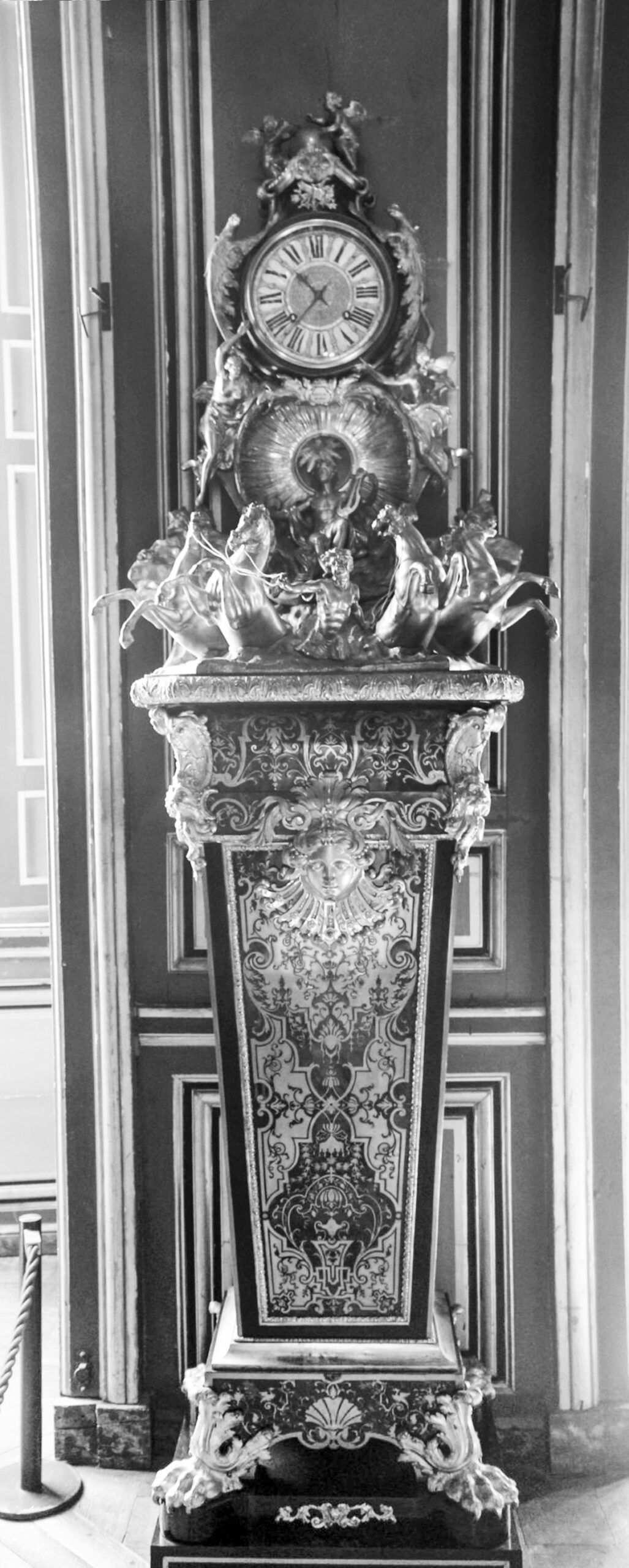 Tous les bronzes caractérisant notre pendule appartiennent bel et bien en revanche aux modèles propres de Cressent. Ils ont en effet été décrits en 1723 dans le cadre d’un rapport d’expertise concernant des effets saisis chez Cressent à la suite d’un procès qui l’opposa à la corporation des fondeurs en bronze, un procès qui se poursuivit jusqu’en 1724 : « Plus deux figures de même façon, représentans Leyda, lesquels sont pour mettre au-dessous de cadrans, lesquelles figures sont réparées […] Plus une autre figure de femme, sortant de la fonte, réprésentant Layda […] Plus deux testes de Mercure sortans de la fonte, aussy imparfaits […] Plus deux sphinx apuyez sur une coquille de roquailles, ornées de leurs aisles et rinceaux de feuilles d’orfan, lesquels sphinx sont finis et cizelés, un desquels sphinx est un modèle […] ». A la demande de Cressent, dans le cadre de la même affaires, plusieurs dépositions de bronziers travaillant pour lui attestèrent du fait que les bronzes litigieux saisis chez lui avaient en fait bel et bien été réalisés par des maîtres fondeurs, ainsi que le spécifiaient les règlements corporatifs de l’époque. Parmi ces derniers, un jeune maître fondeur âgé de vingt-trois ans et demi, Guillaume Lombard (v. 1700 – après 1751) déclara « qu’il a réparé et cizelé pour ledit Cressen […] quatre garniture de pendules à Léda et les pieds portés par deux sphinx […]. Ces précieuses informations attestent sans conteste que les pendules de notre modèle furent belle et bien assemblées par Cressent dans son atelier aux alentours des années 1720-1723. Mais celui-ci n’ayant jamais utilisé de marqueterie dite ‘Boulle’ dans sa production, autrement que pour quelques-unes de ses pièces d’horlogerie, Calin Demetrescu a avancé l’hypothèse que les boîtes de ces pendules, ainsi que leurs consoles et gaines associées présentant ce type de décor, aient été en réalité exécutées avant mai 1719 dans l’atelier de Joseph Poitou (v. 1680-1719). Ce dernier, qui pratiquait en effet la marqueterie de cuivre et d’écaille, était précisément devenu, au cours de cette période, le principal collaborateur de Cressent en matière d’ébénisterie. Les deux hommes étaient particulièrement proches, au point que Cressent, à la mort de son fidèle collaborateur, devint le tuteur de son unique enfant alors mineur, Marguerite-Joseph Poitou, et épousa, dès le mois de septembre de la même année, en secondes noces, sa veuve, Claude Poitou, née Chevanne.