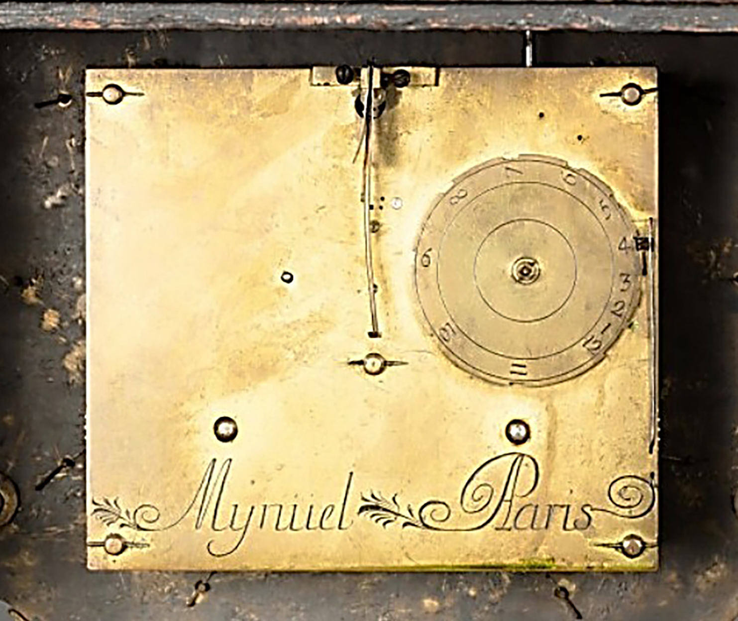 Toutes les pendules de notre modèle – excepté la quatrième mentionnée plus haut vendue par Sotheby’s Londres, le 6 juillet 1984, lot n° 11 – ont reçu des mouvements de Louis Mynuel, qui fut sans conteste l’un des plus importants horlogers du début du XVIIIe siècle, particulièrement réputé pour l’excellence de ses mouvements.