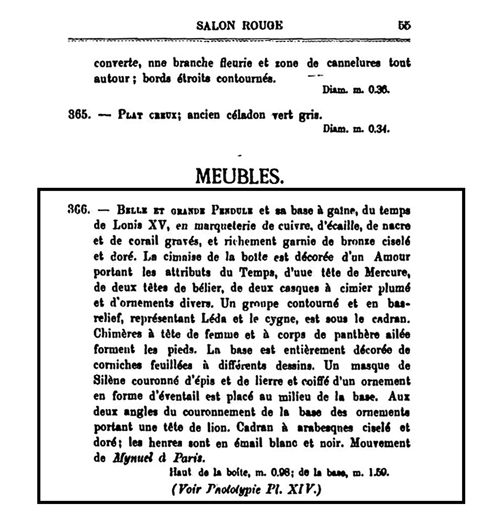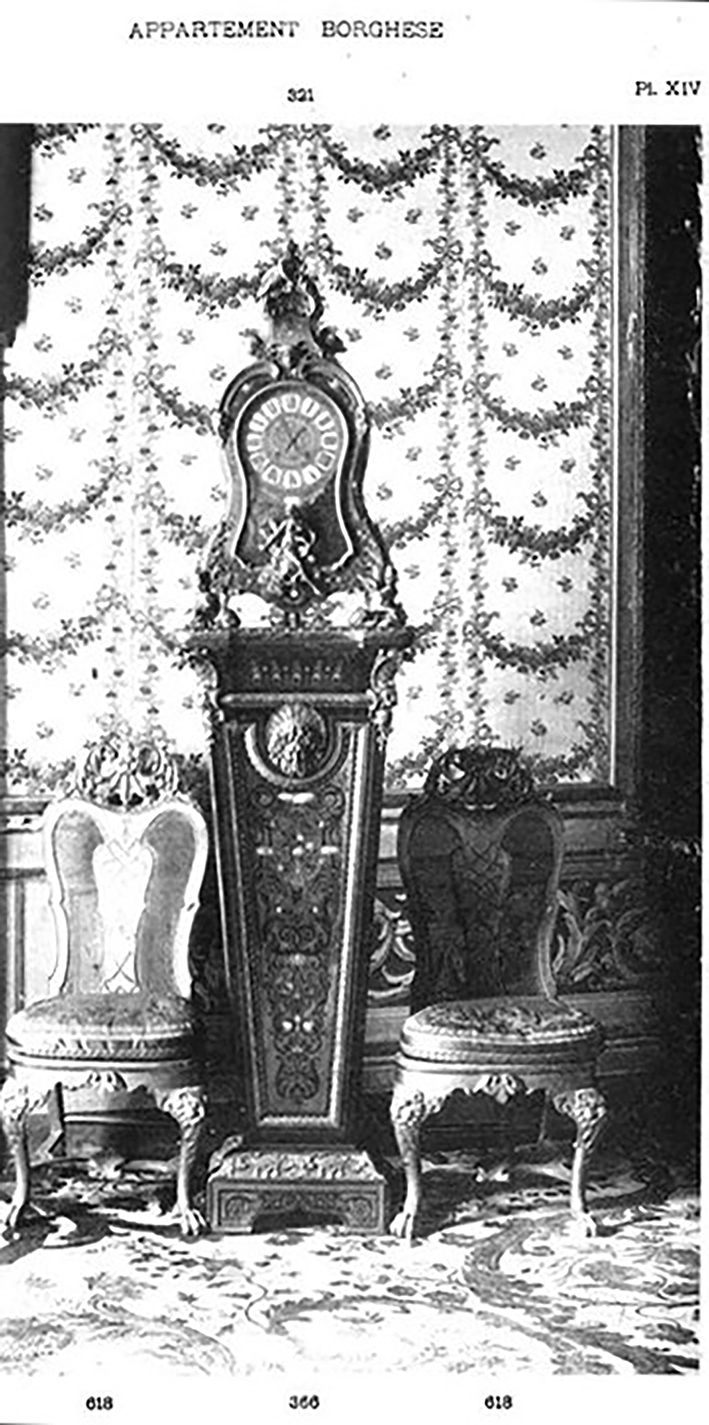 Le palais Borghèse, à Rome, fut ainsi vendu, ses collections dispersées aux enchères (ill. 14). Une première vente anonyme d’objets d’art et d’ameublement se tint à Paris, à la galerie Georges Petit, sous le ministère de Me Paul Chevallier, du 2 au 3 juillet 1891. Une seconde eut lieu à Rome l’année suivante, dispersant du 28 mars au 9 avril, les meubles et les objets d’art, dont notre pendule et sa gaine, qui garnissaient le grand appartement au premier étage du palais Borghese (ill. 12, 13&15).