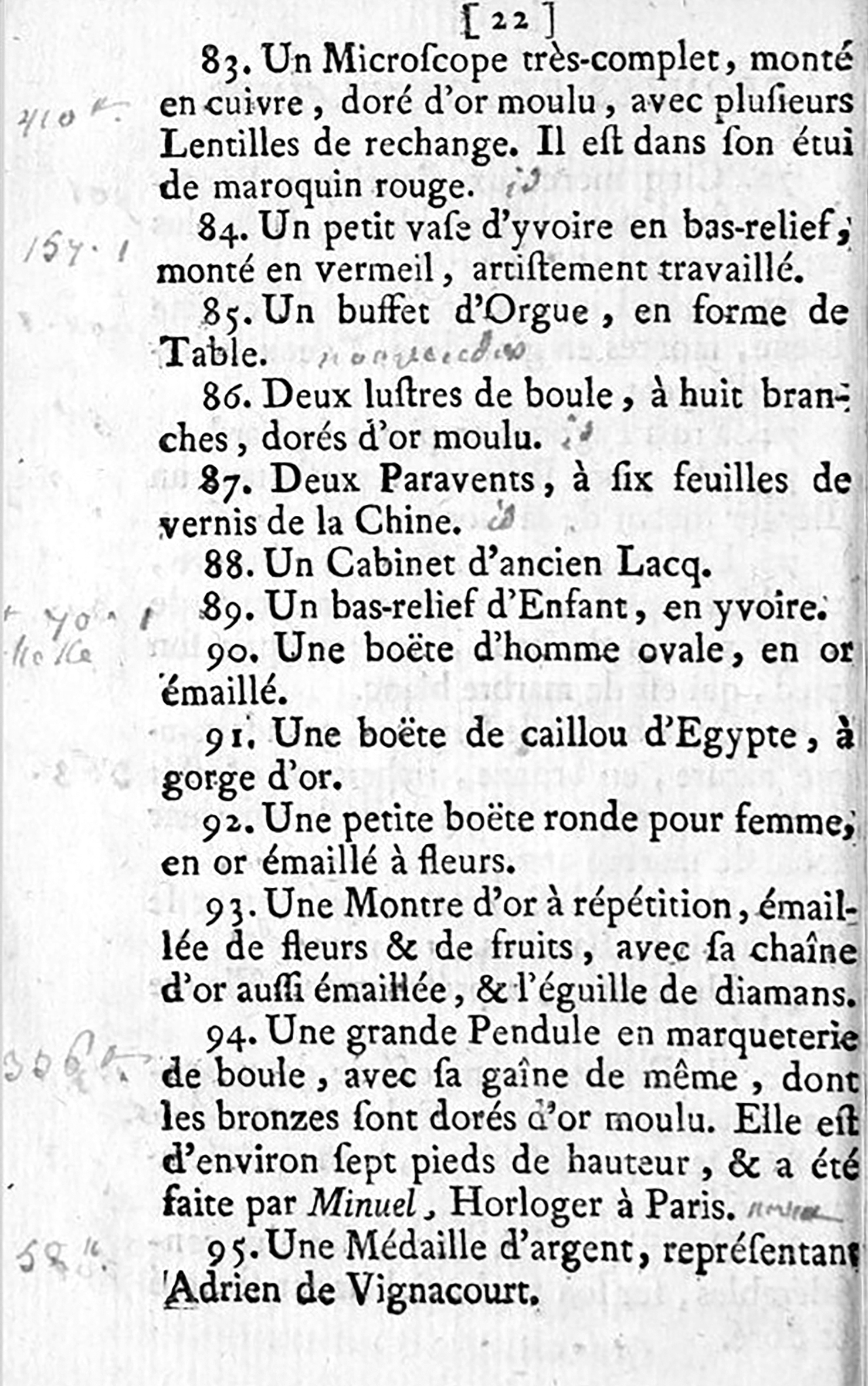 « Une grande Pendule en marqueterie de boule, avec sa gaîne de même, dont les bronzes sont dorés d’or moulu. Elle est d’environ sept pieds de hauteur, & a été faite par Minuel, Horloger à Paris », dont la description pourrait correspondre à la nôtre, exception faite de sa hauteur plus petite – sept pieds correspondant à 227,36 cm. – fut vendue aux enchères à Paris, le 10 décembre 1764, à l’hôtel d’Aligre, rue Saint-Honoré. Elle fut acquise à la vente par le marchand d’art Neveu pour la très importante somme de 3060 livres, nous donnant ainsi un exemple concret de la valeur pour le moins conséquente d’une telle pendule et de sa gaine à la fin du règne de Louis XV (ill. 10&11).