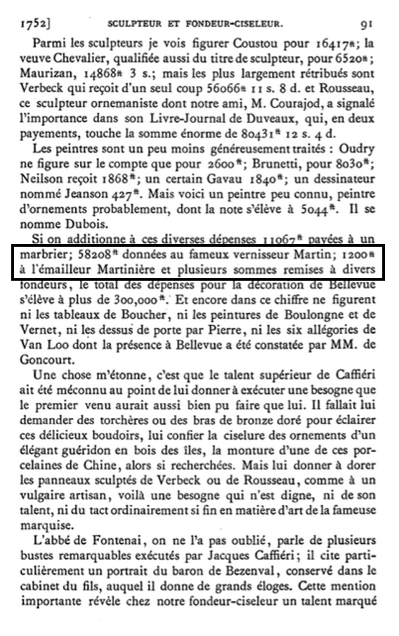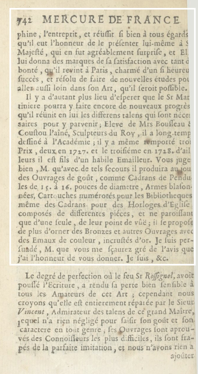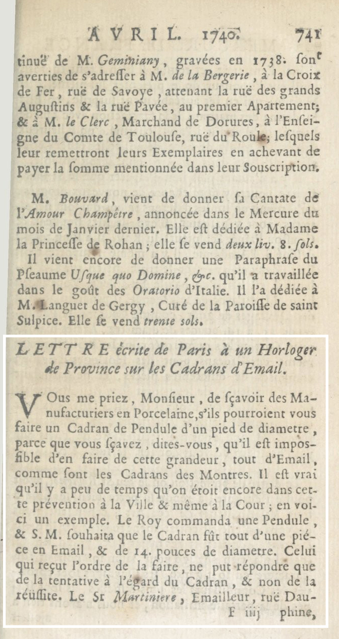 Martinière fut le premier à réaliser des objets de grande taille en émail, une prouesse saluée par l’édition du Mercure de France du mois d’avril 1740, p. 741-742 : « Le Sr Martiniere, Emailleur, ruë Dauphine, l’entreprit [un cadran de pendule d’une seule pièce en émail et de 14 pouces de diamètre, soit 38 cm.], et réussit si bien à tous égards qu’il eut l’honneur de le présenter lui-même à Sa Majesté, qui en fut agréablement surprise, et Elle lui donna des marques de sa satisfaction avec tant de bonté, qu’il revint à Paris, charmé d’un si heureux succès, et résolu de faire de nouvelles études pour aller aussi loin dans son Art, qu’il seroit possible […] ».