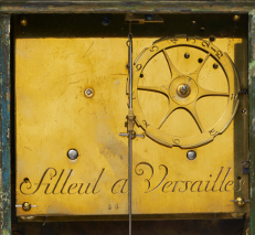 Martiniere, fecit. 1751, visible à droite de la partie inférieure de la plaque émaillée ornant, en façade, la console d’applique supportant la pendule.