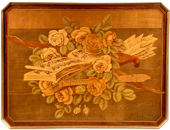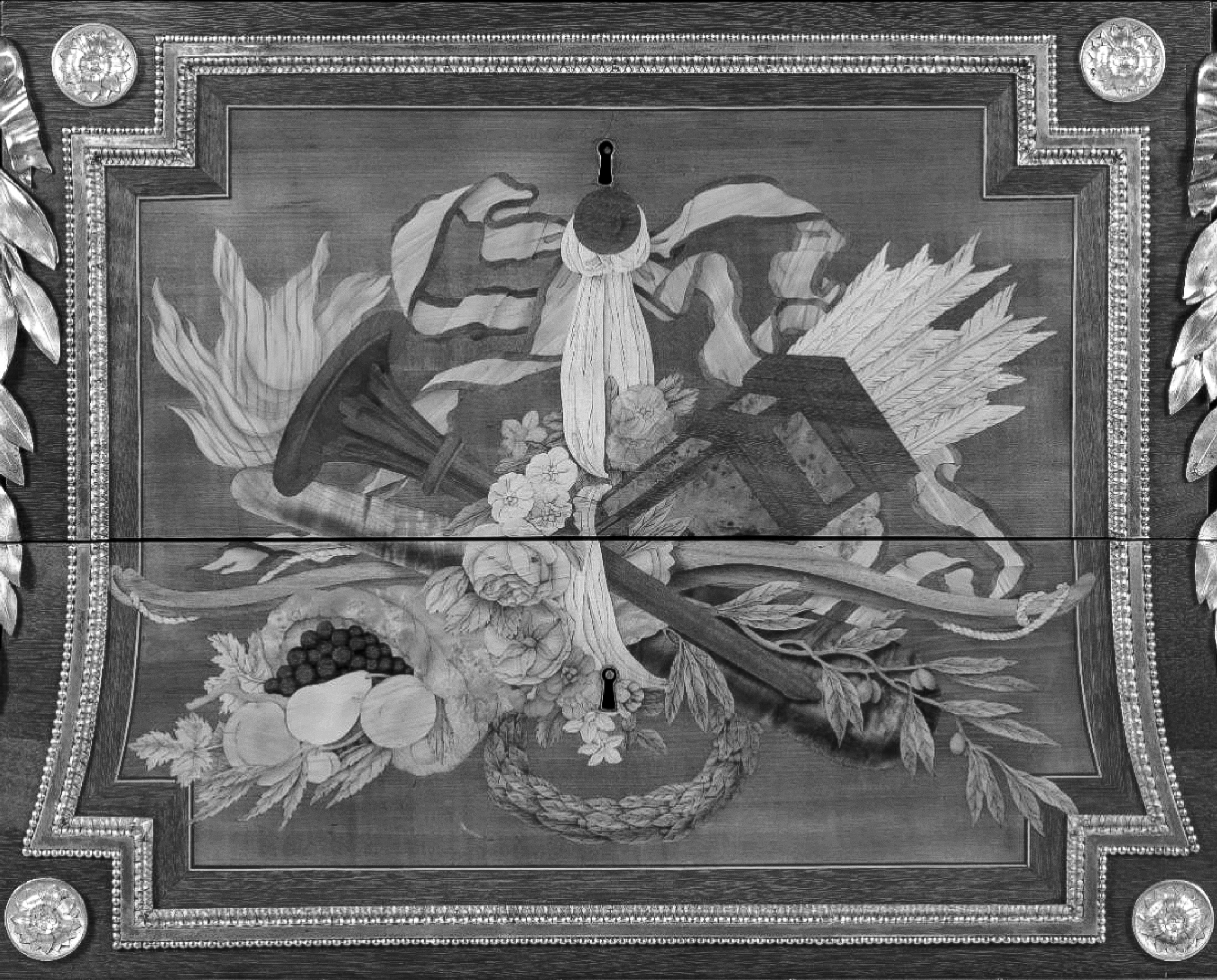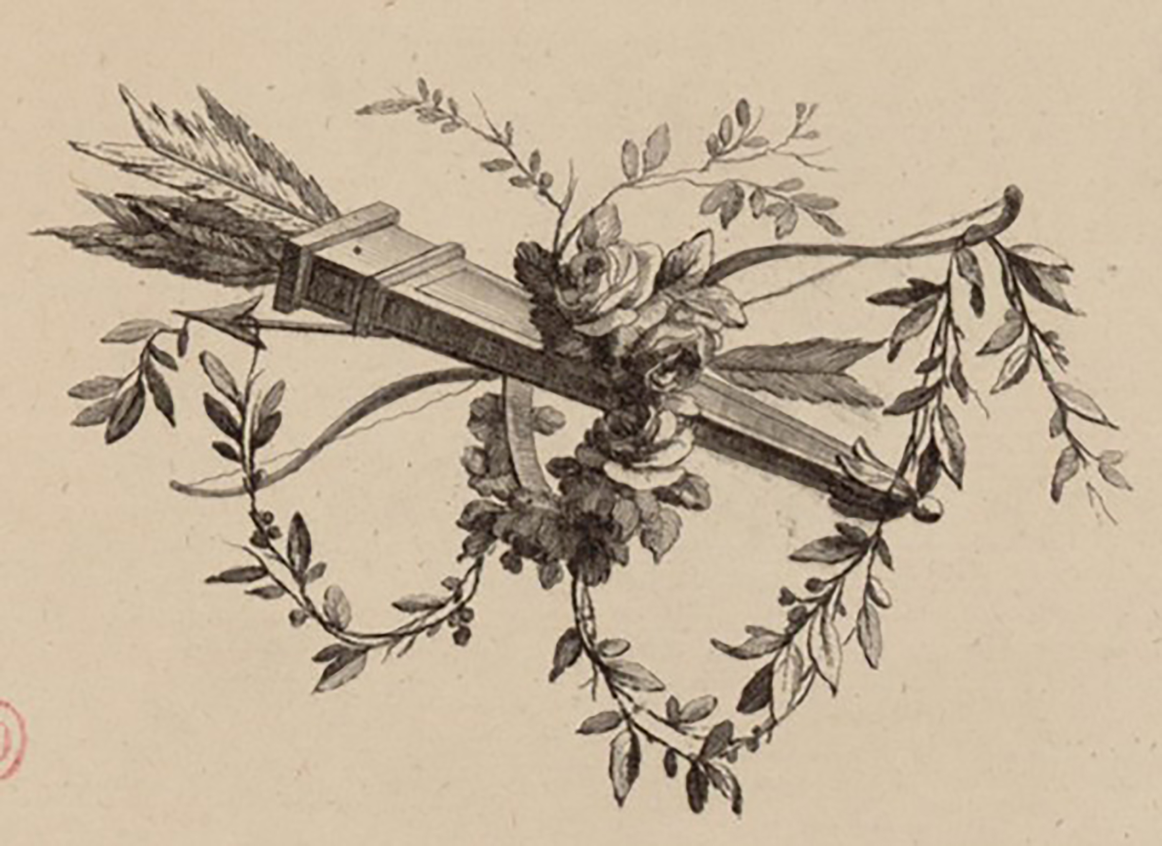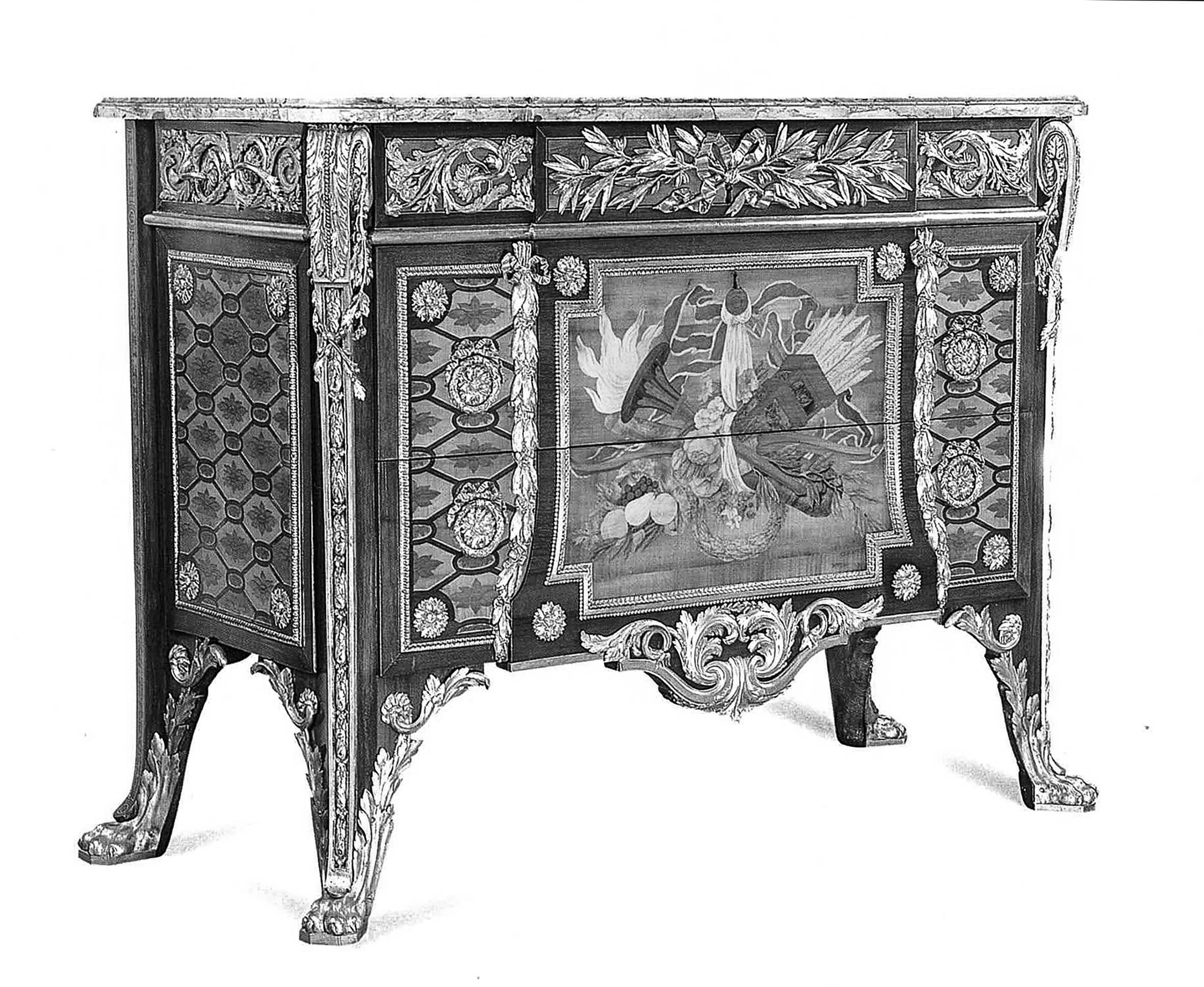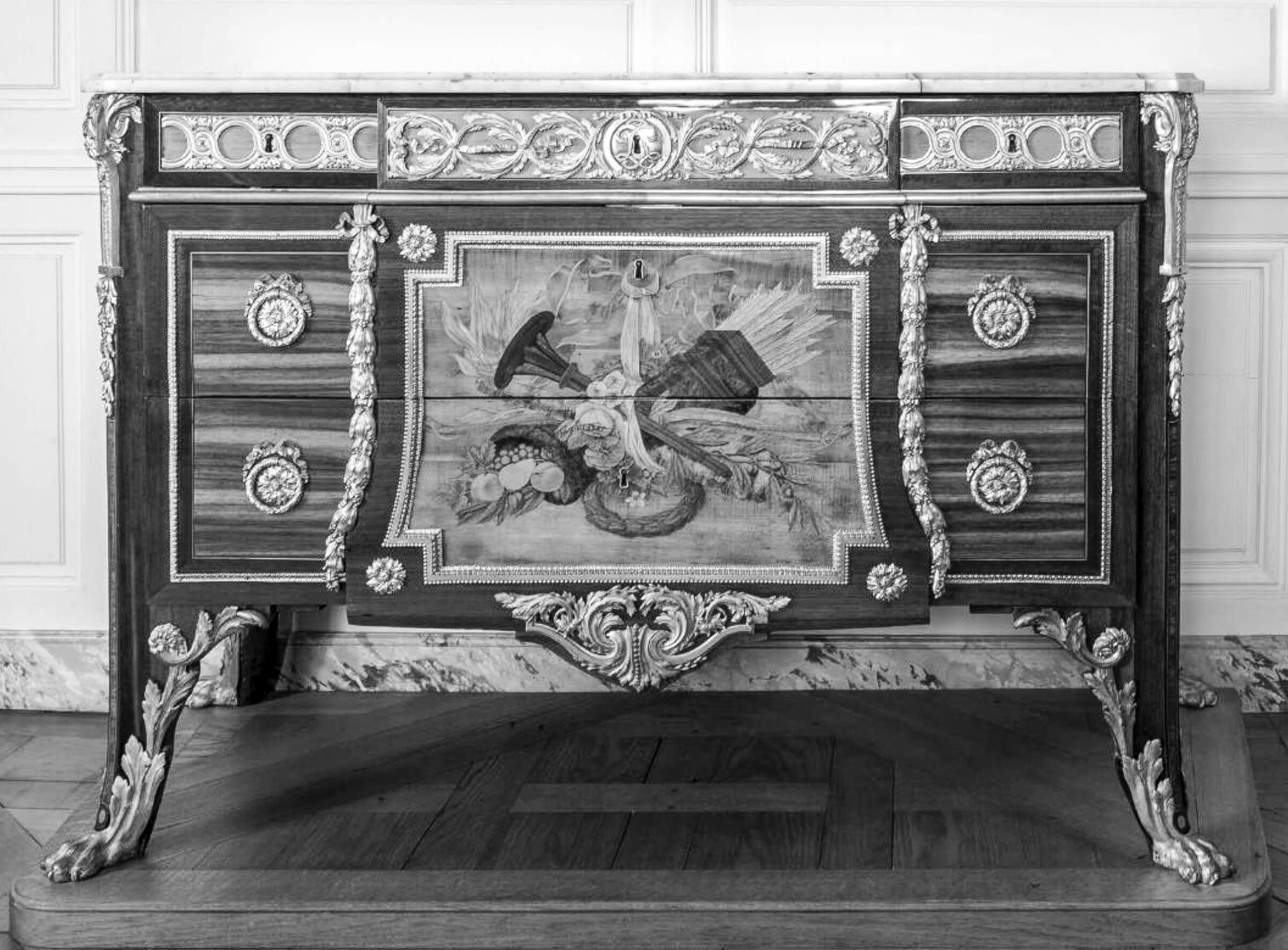 Riesener dût très certainement s’inspirer ici des modèles de trophées imaginés par Pierre Ranson (1736-1786), peintre de fleurs et d’arabesques, qui publia précisément dans ces années 1775-1780, plusieurs Cahiers de modèles de trophées parmi lesquels nous retrouvons précisément ces motifs de couronnes feuillagées de roses et de fleurs cerclant des instruments de musiques agrémentés de partitions, ainsi que des arcs, et des carquois, dont certains présentent exactement cette forme quadrangulaire marquée d’un enroulement dans la partie supérieure. Au cours de cette même période 1775-1780, Riesener orna de trophées de musique ou à motifs entrecroisés de torche, carquois et corne d’abondance, plusieurs meubles importants, dont plusieurs firent l’objet de commandes du Garde-Meuble de la Couronne : citons en particulier la commode livrée par lui, le 6 août 1777, accompagnée d’un bureau plat, d’un secrétaire et d’une table à écrire, « pour le service du Roy au château de Trianon », enregistrée sous le n° 2906 du Journal du Garde-Meuble de la Couronne, provenant de la collection du baron Edouard de Rothschild (1868-1949), et aujourd’hui conservée au château de Versailles ; ou encore celle, datée entre 1775 et 1780, des collections du duc d’Abercorn, conservée au musée Calouste Gulbenkian, à Lisbonne.