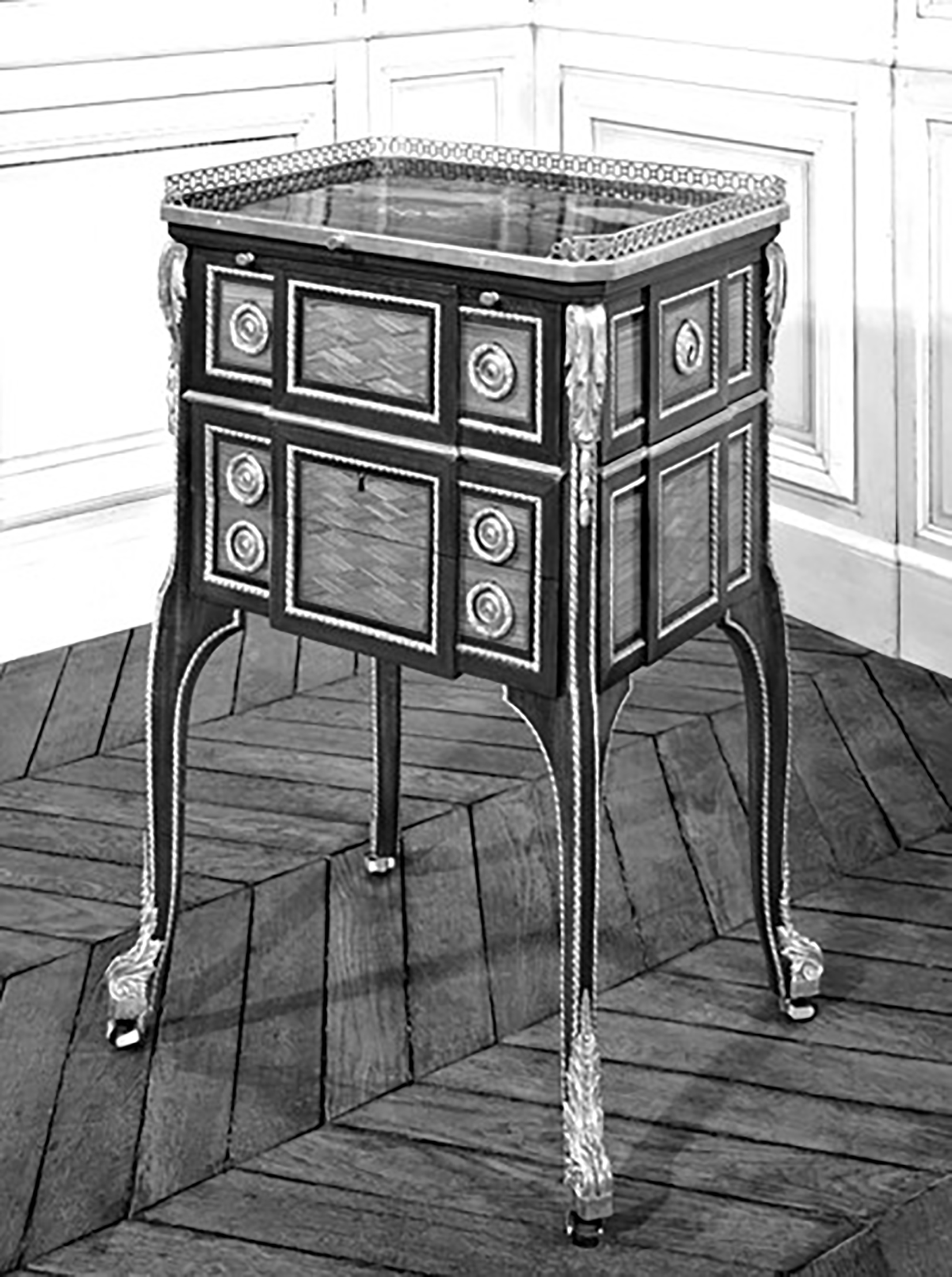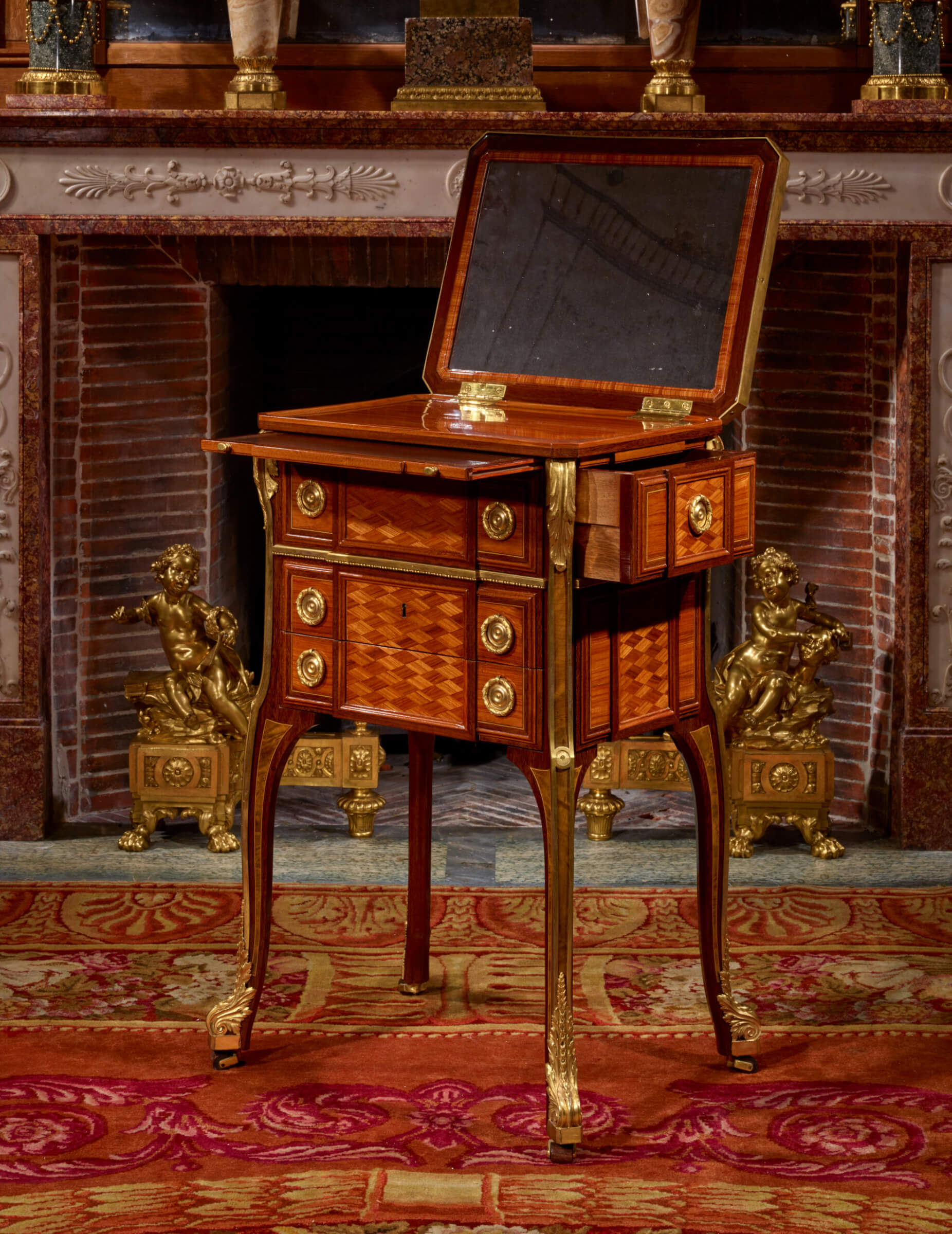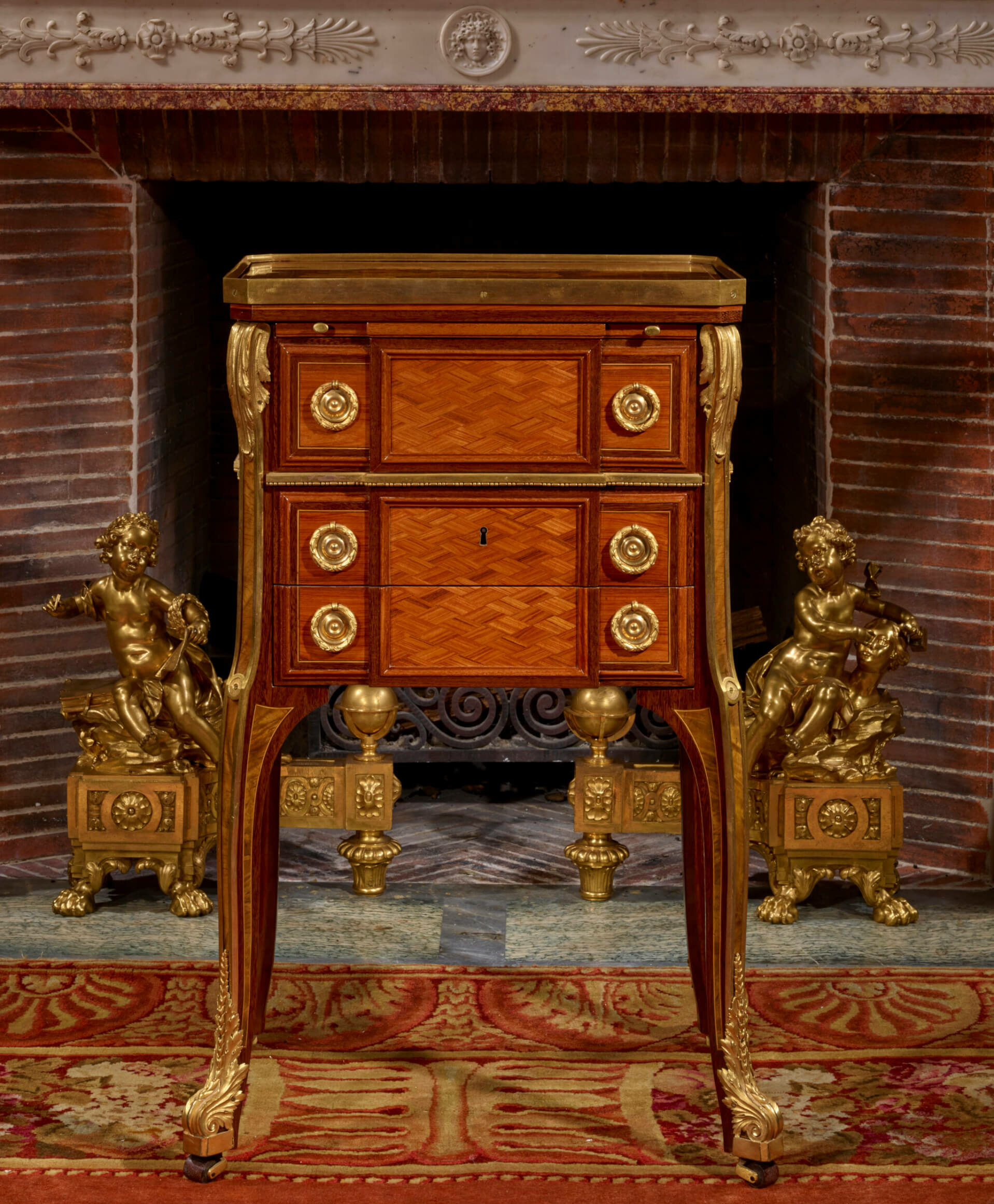 Datée vers 1775, cette table « chiffonnière » ou « à ouvrage », provenant de la collection du comte Patrice de Vogüé (1928-2020) au château de Vaux-le-Vicomte, en Seine-et-Marne, est le seul exemplaire répertorié de ce modèle portant à trois reprises l’estampille de Jean-Henri Riesener (1734-1806). On connaît une autre table de ce modèle, mais non estampillée, ayant successivement appartenu aux collections de Bernard Steinitz, puis de Nicolas Cattelain, qui a été présentée au château de Versailles en 2014-2015, formant le lot n° 75 de l’exposition 18e aux sources du design. A ces deux tables, il convient également d’ajouter celle, plus tardive – datée vers 1780-1784 – intégralement plaquée en acajou, provenant de la collection de Richard Seymour-Conway (1800-1870), 4e marquis d’Hertford, aujourd’hui conservée au sein de la Wallace Collection, à Londres.