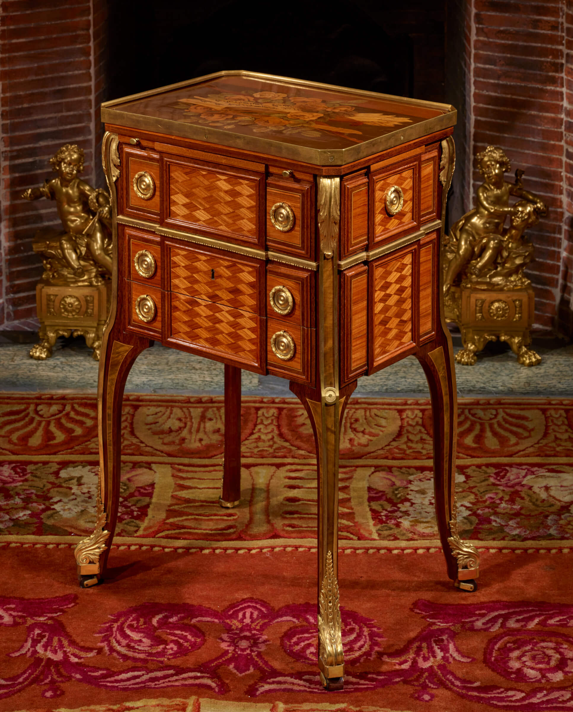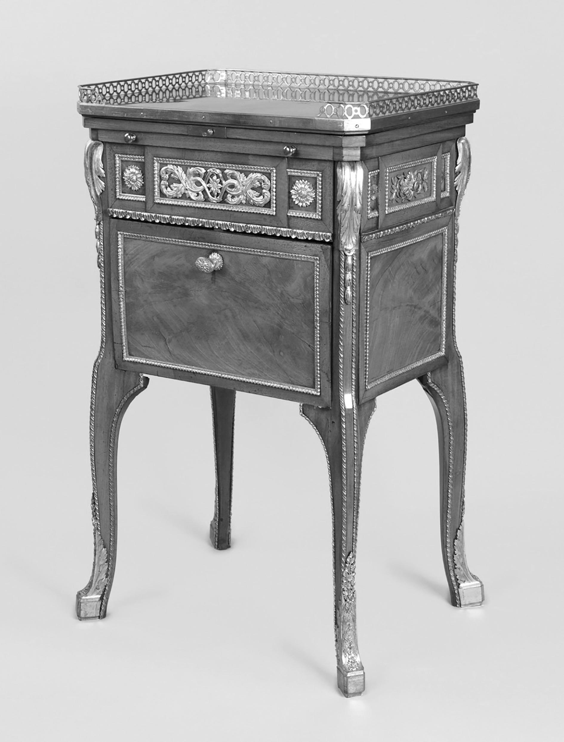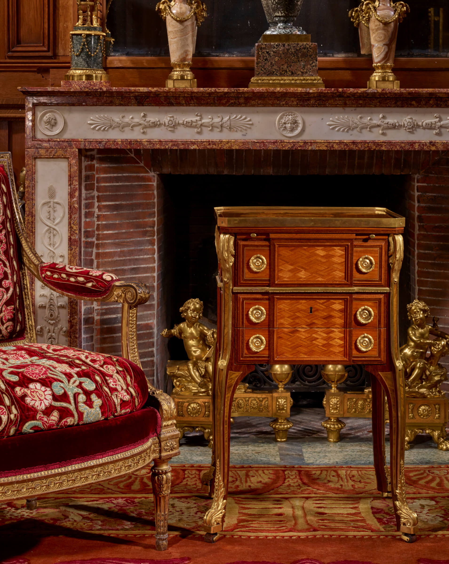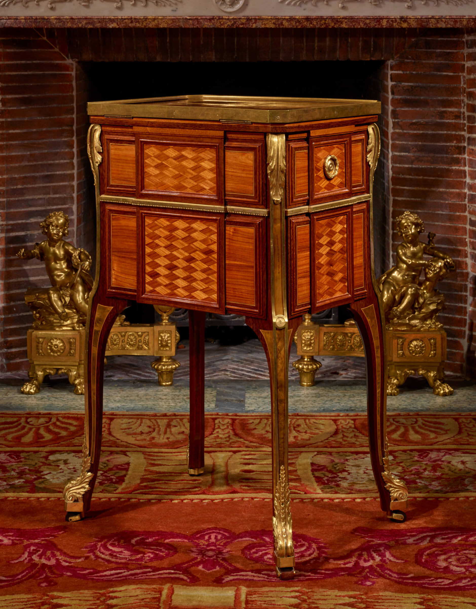Datée vers 1775, cette table « chiffonnière » ou « à ouvrage », provenant de la collection du comte Patrice de Vogüé (1928-2020) au château de Vaux-le-Vicomte, en Seine-et-Marne, est le seul exemplaire répertorié de ce modèle portant à trois reprises l’estampille de Jean-Henri Riesener (1734-1806). On connaît une autre table de ce modèle, mais non estampillée, ayant successivement appartenu aux collections de Bernard Steinitz, puis de Nicolas Cattelain, qui a été présentée au château de Versailles en 2014-2015, formant le lot n° 75 de l’exposition 18e aux sources du design. A ces deux tables, il convient également d’ajouter celle, plus tardive – datée vers 1780-1784 – intégralement plaquée en acajou, provenant de la collection de Richard Seymour-Conway (1800-1870), 4e marquis d’Hertford, aujourd’hui conservée au sein de la Wallace Collection, à Londres.