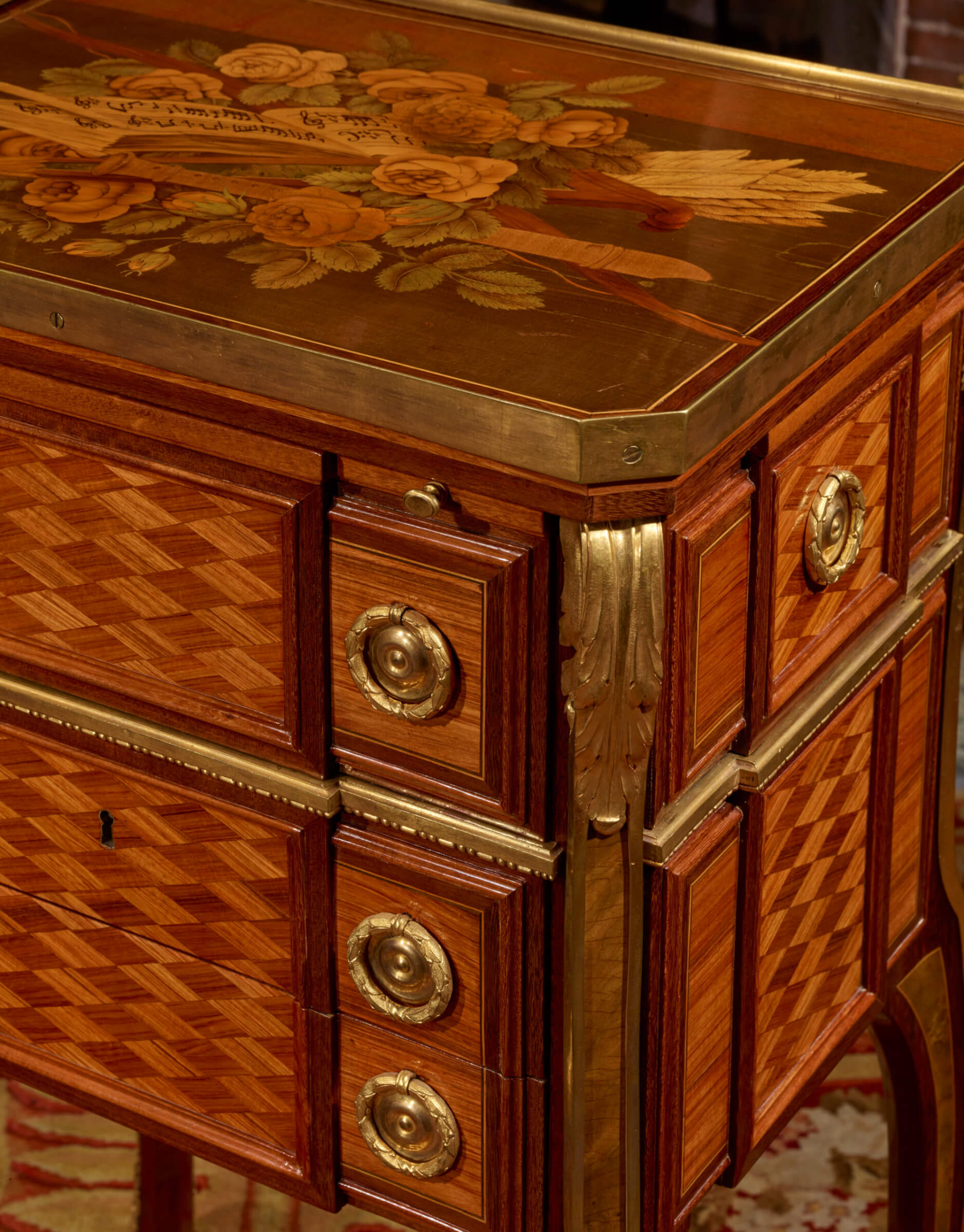 Les angles à pans coupés et en ressaut du corps du meuble, couronnés chacun d’une chute de bronze doré à enroulement d’acanthes, et dont les arêtes antérieures sont enrichies de filets de bronze, affichent un subtil décrochement, rehaussé d’un disque de bronze, à l’amorce des quatre pieds « en console », de section hexagonale et à faces très légèrement concaves, supportant la table. Une découpe rectiligne répondant à celui des ressauts des quatre faces singularise le départ de ces pieds qui sont chacun terminés d’un très riche sabot à ample enroulement de feuille d’acanthe et épis central, reposant sur une base quadrangulaire à pans coupés montée sur roulette. Les compartiments hors ressauts des quatre côtés de la table sont plaqués en bois de rose disposé dans des encadrements en amarante, rehaussé de filets de bois clair, et de fines baguettes moulurées exécutées en bois de rose massif ; ceux des ressauts se distinguent avec une sobre marqueterie à mosaïque de losanges également traitée en bois de rose, à encadrement de baguettes moulurées de la même essence bordées par des encadrements en amarante sans filets de bois clair.