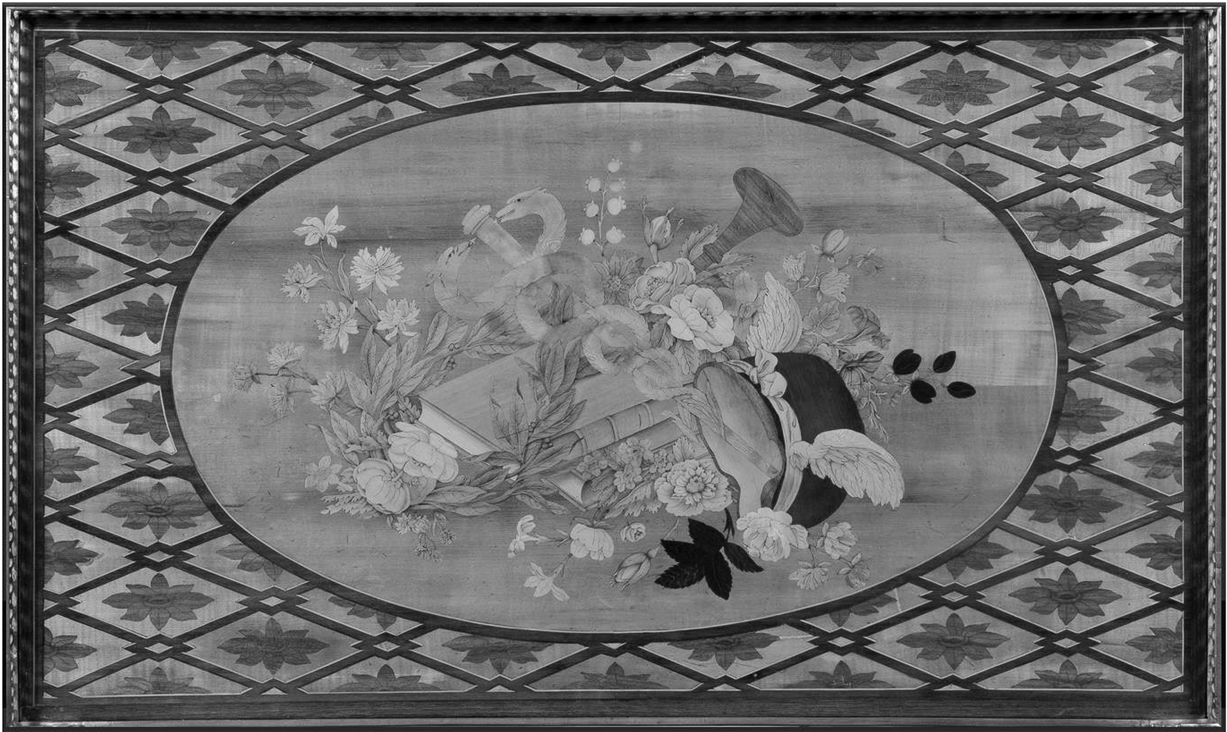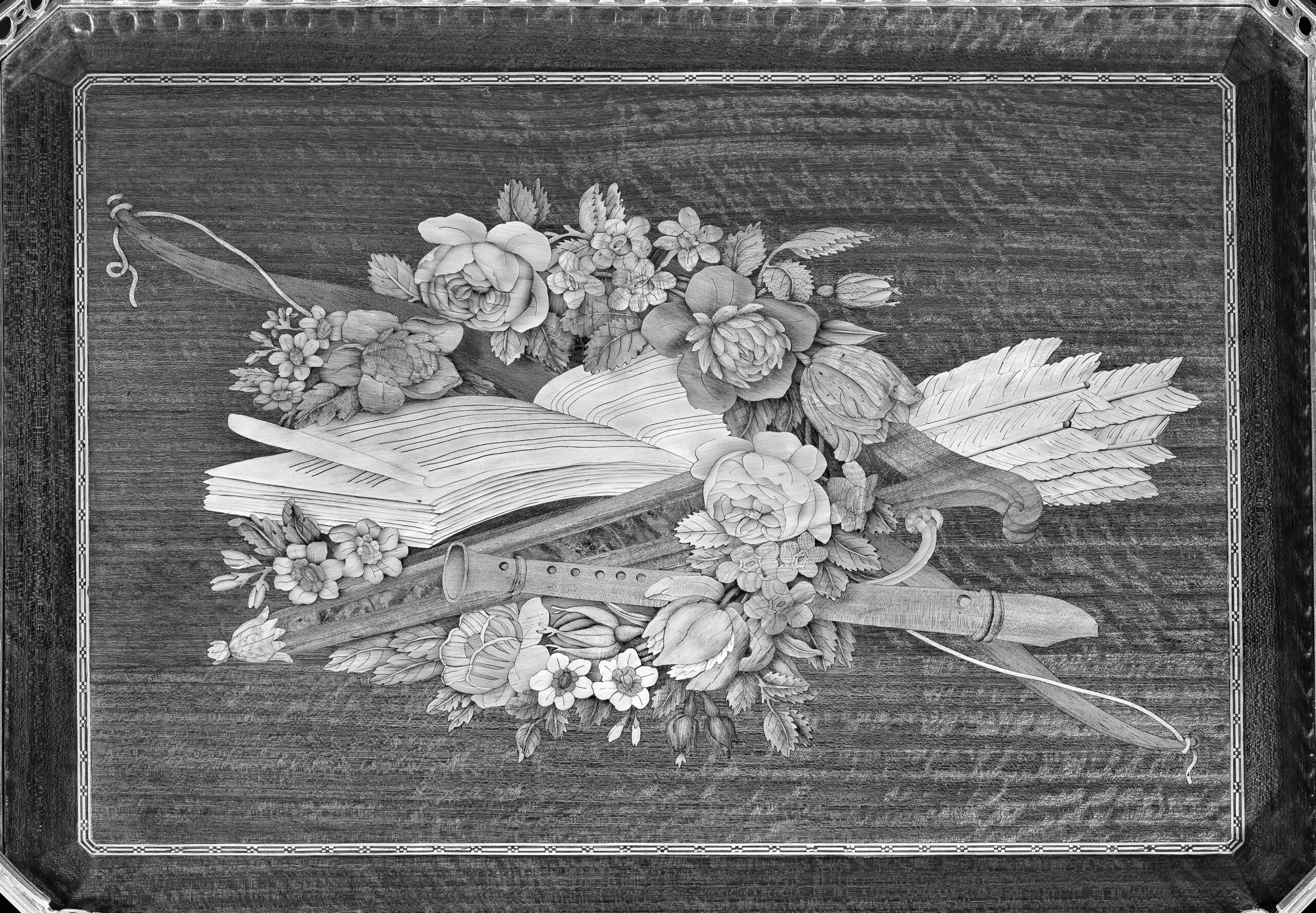 Un double plateau, formant un léger débord, couronne la table. Le plateau inférieur est fixe, et présente un léger encaissement intégralement plaqué en bois de rose et rehaussé par un encadrement en amarante et filet de bois claire dessinant des quarts-de-rond aux angles. Le plateau supérieur, enrichi d’une lingotière de bronze à bandeau uni, est monté à charnières, et présente, une fois ouvert, un revers couvert d’une glace ceinte d’une baguette moulurée de bois de rose et bordure en amarante, permettant ainsi de transformer la table en « toilette ». Le dessus de ce plateau montre, dans un encadrement en amarante et filet de bois clair, un luxuriant trophée en bois polychromes, contrastant sur un fond de sycomore teinté vert, à motifs de partition, flûte à bec, arc et carquois entrecroisés et ceints d’une luxuriante couronne feuillagée de roses.