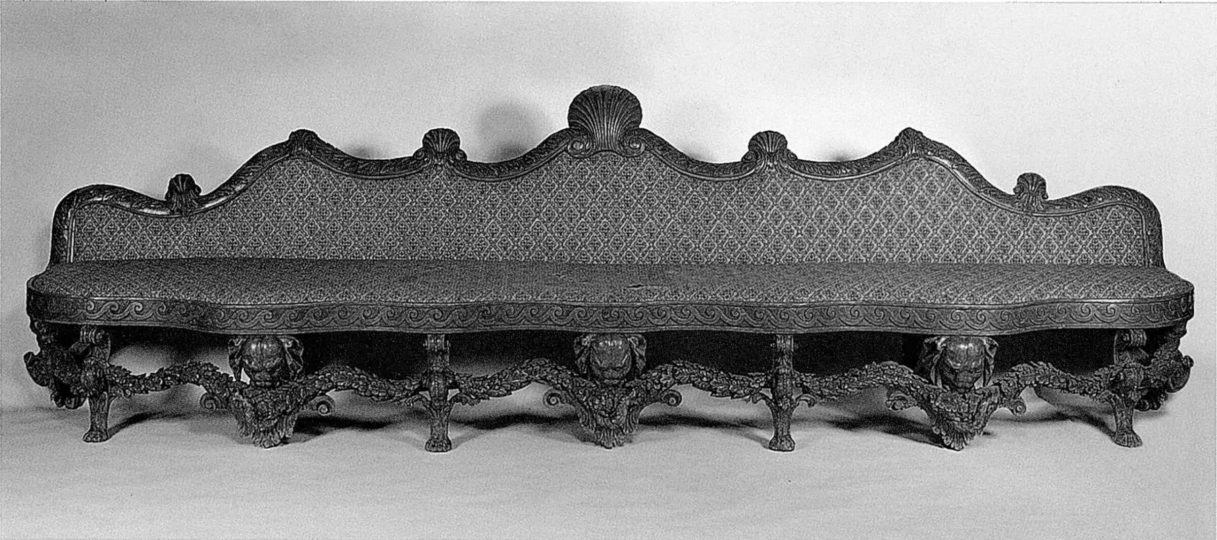 Ce dessin à la mine de plomb sur papier forme la planche n° 98 d’un album de dessins intitulé « Original Designs by Matts Lock, Carver 1740-1765 ». C’est ce précieux document iconographique qui a permis d’attribuer avec certitude, non seulement notre console et les tabourets ou « petites tables » à têtes d’éléphant cités plus haut, mais également le petit corpus de table-console similaires à la nôtre mais à masque d’Hercule. Parmi ces dernières, citons la paire de consoles exécutées pour le compte de George Lee, 2e comte de Lichfield (1690-1743), à Ditchley Park, Oxfordshire, appartenant aujourd’hui aux collections du Leeds Museum, au sein de la Temple Newsam House, à Leeds, dans le Yorkshire ; la console en bois doré et peint à l’imitation du bronze antique des ducs de Hamilton, à Hamilton Palace, en Ecosse, conservée au Metropolitan Museum of Art, à New York ; la console commanditée pour Philip Yorke (1690-1764), 1er comte de Hardwicke, à Wimpole Hall, dans le Cambridgeshire, où elle se trouve toujours ; la paire de consoles exécutées pour le comte de Lichfield, à Shugborough Hall, dans le Staffordshire, où elles sont également toujours conservées ; et la paire de consoles plus étroites et à motif central de coquille, conservée dans les collections du Sir John Soane’s Museum.