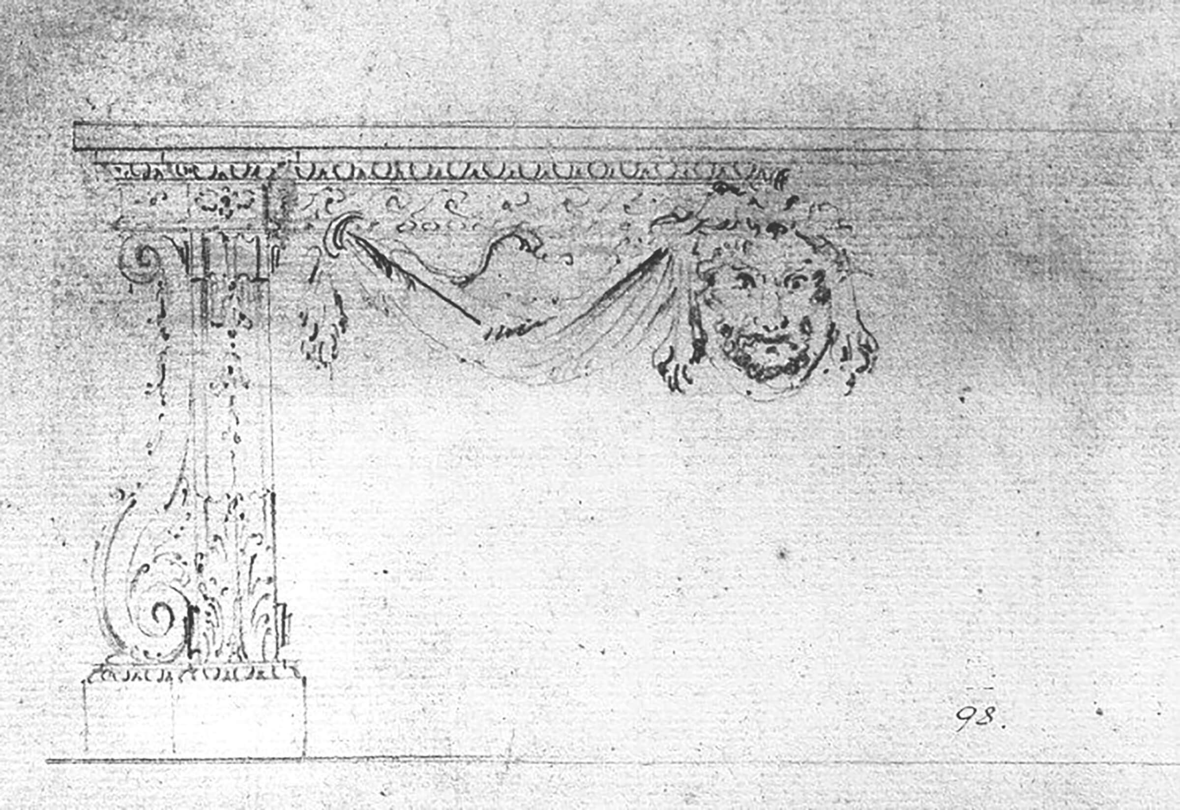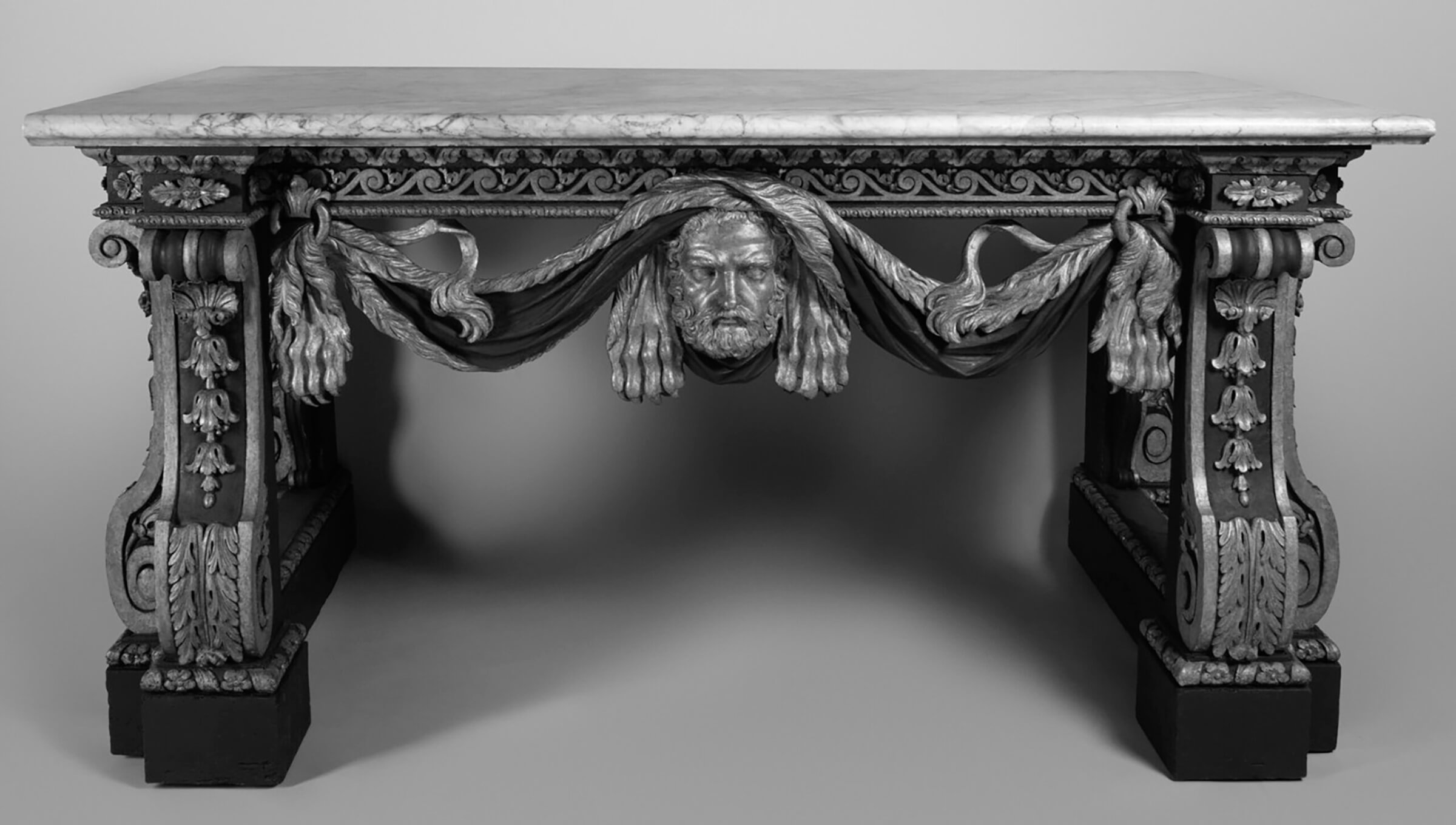 Le Victoria & Albert Museum, à Londres, conserve un dessin de Matthias Lock daté vers 1740 et montrant un projet de console similaire à la nôtre (ill. 1), exception faite de la tête d’éléphant, remplacée ici par un masque d’Hercule ‘coiffé’ de la dépouille du lion de Némée. La ceinture à frises de postes et la disposition des jambages en forme de consoles à enroulements ornées de chutes de fleurons et de feuilles d’acanthes et reposant sur une plinthe, sont en revanche rigoureusement identiques.