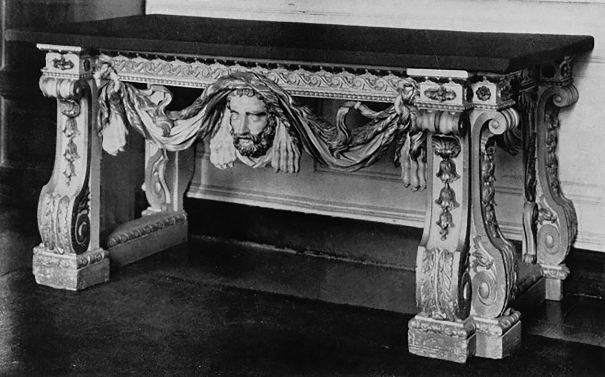 De forme rectangulaire, elle présente une puissante ceinture à bordures moulurées, ornée d’amples frises de postes en aplat contrastant sur des fonds travaillés au pointillé, surmontée d’une corniche moulurée formant un large débord, à doucine sculptée sur tout son pourtour d’une courte frise d’acanthes, le tout rythmée en façade au moyen de trois forts ressauts enrichis de quartefeuilles et de feuilles d’acanthes. Celui du centre, plus large, est singularisé par un motif de cartouche circulaire à enroulements, en forme de pelta inversée, enfermant un fleuron d’acanthe. Une extraordinaire tête d’éléphant traitée au naturel, sculptée en ronde-bosse, souligne ce dernier, flanquée de deux puissantes accolades composées d’un riche drapé à motifs floraux et bordures à franges, contenant, au sein de chaque accolade, une luxuriante composition de fruits et de branches feuillagées, le tout maintenu au moyen de deux opulents nœuds fixés contre les pieds antérieurs du piètement de la console.