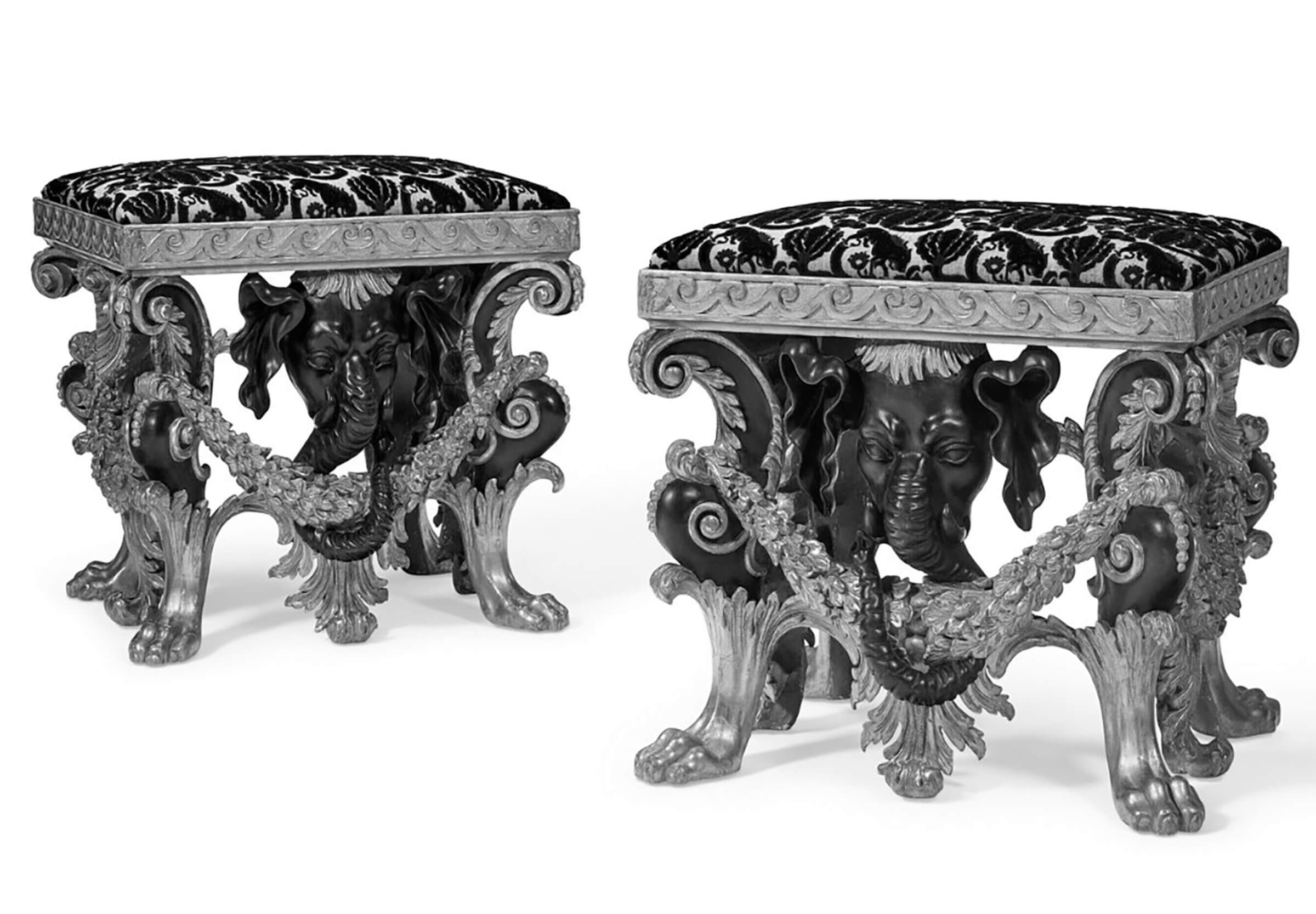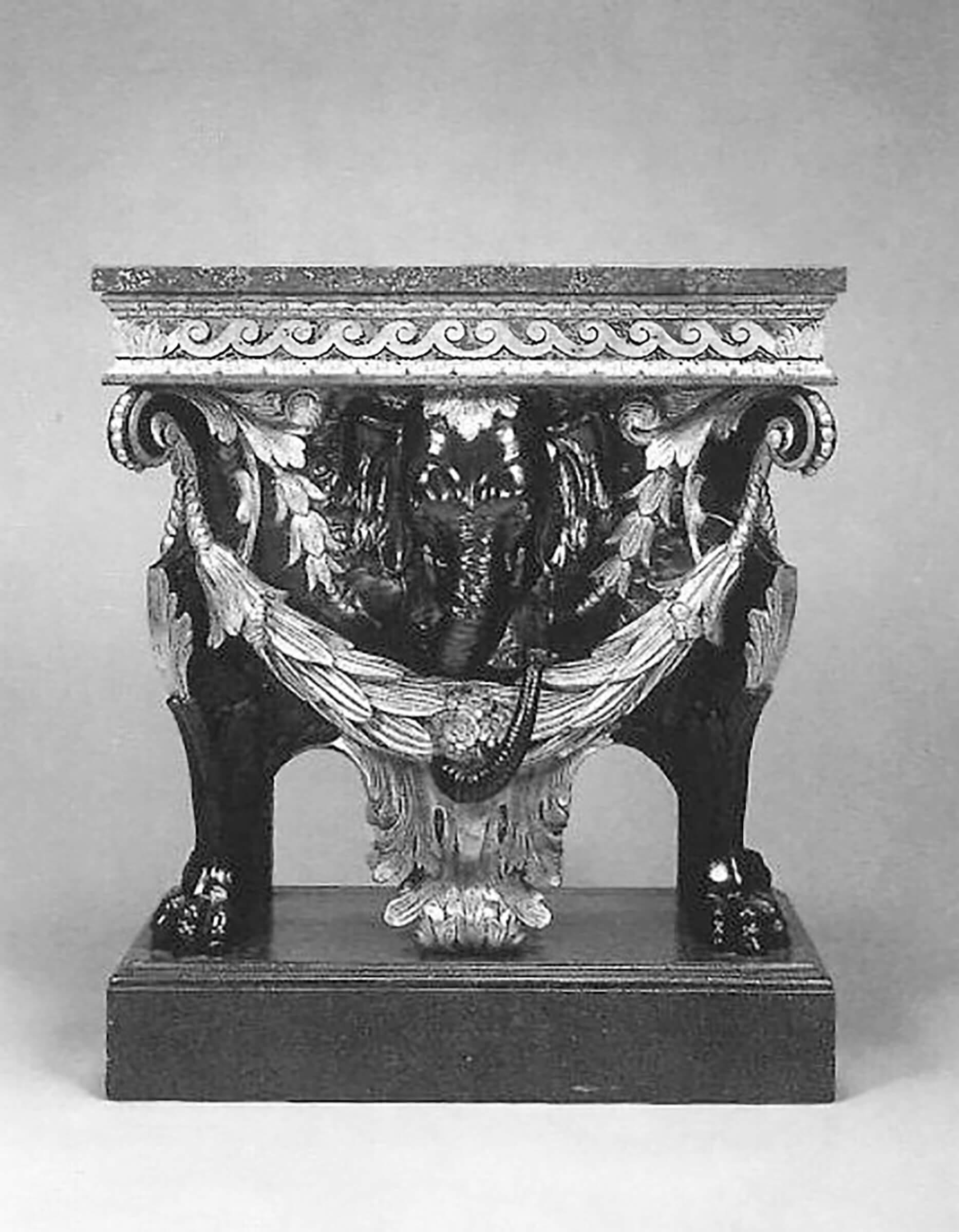 Appartenant à ce même corpus, un tabouret similaire à ceux de Castle Hill reproduits plus haut, présentant quelques variantes, en particulier au niveau de la guirlande retenue par la trompe de l’éléphant, et transformé en petite table au cours du XXe siècle (plinthe et plateau de porphyre modernes), fit partie de tout un ensemble de meubles et de sièges à têtes d’éléphant livré pour le compte de John Poulett (v. 1668-1743), 1er comte Poulett, à Hinton House, dans le Somerset (ill. 4). Demeuré dans sa descendance, cette « table » fut vendue par Sotheby’s, à Londres, le 1er novembre 1968, lot n° 66. Elle entra par la suite dans la collection de S. Jon Gerstenfeld.