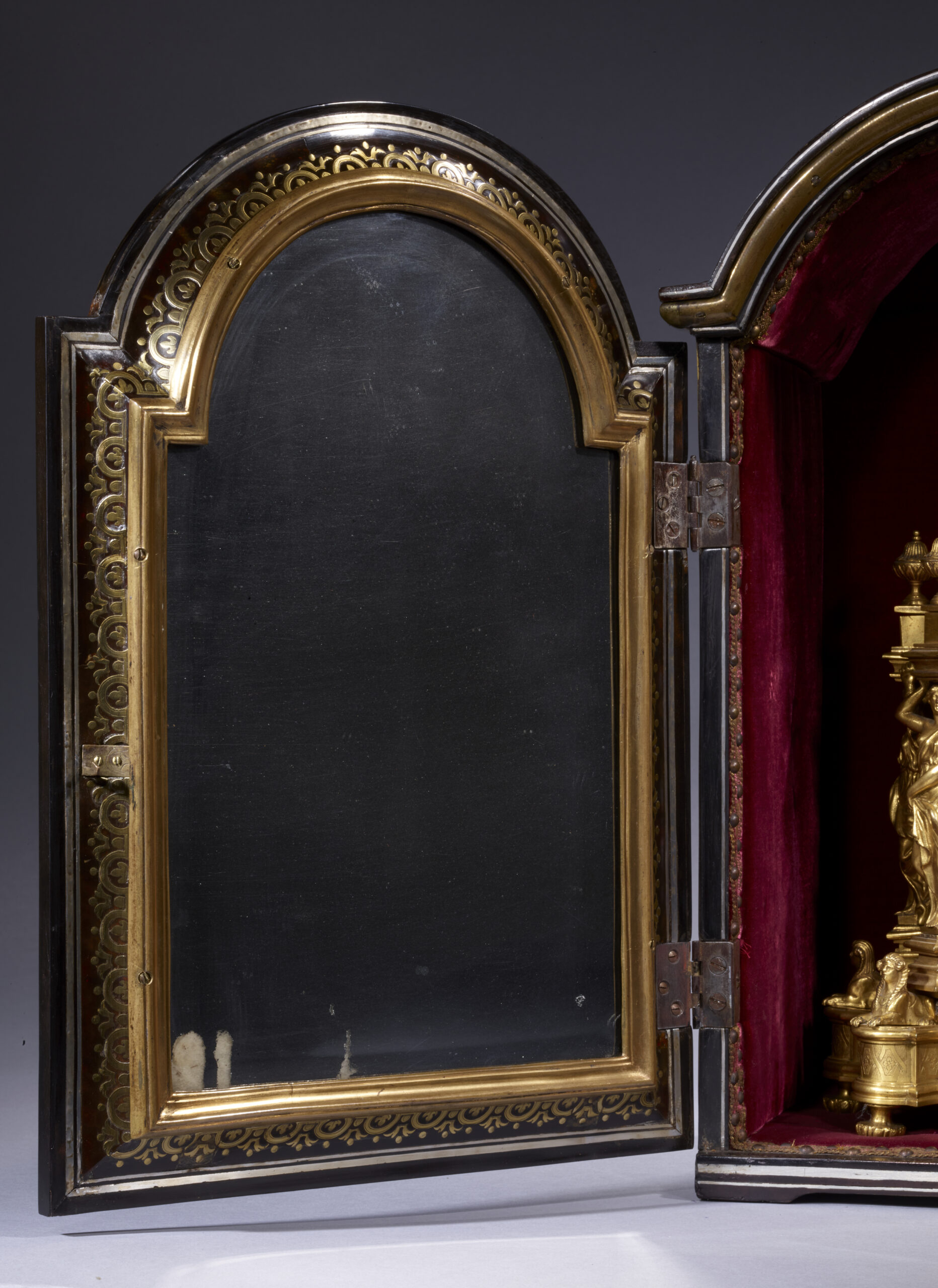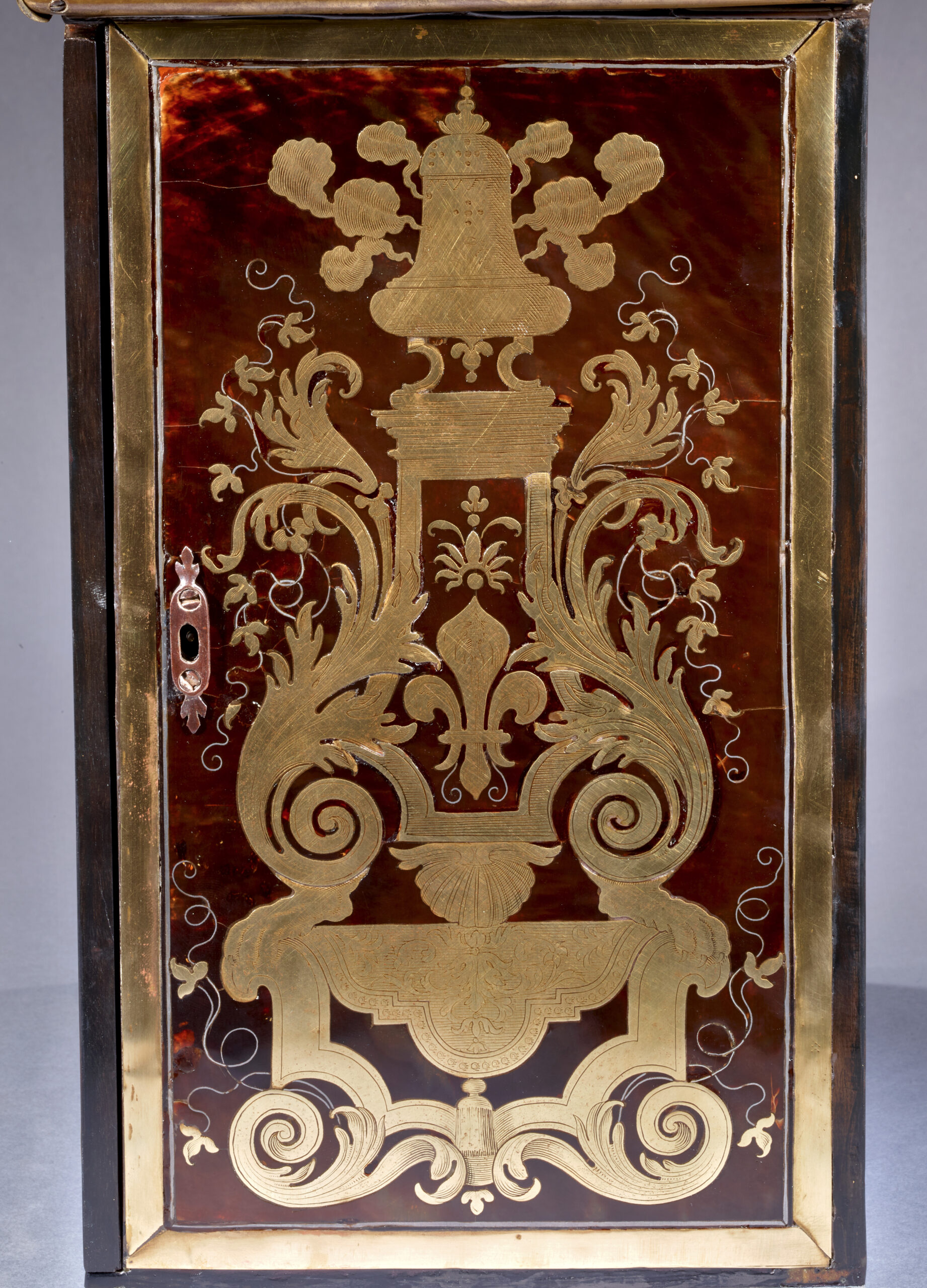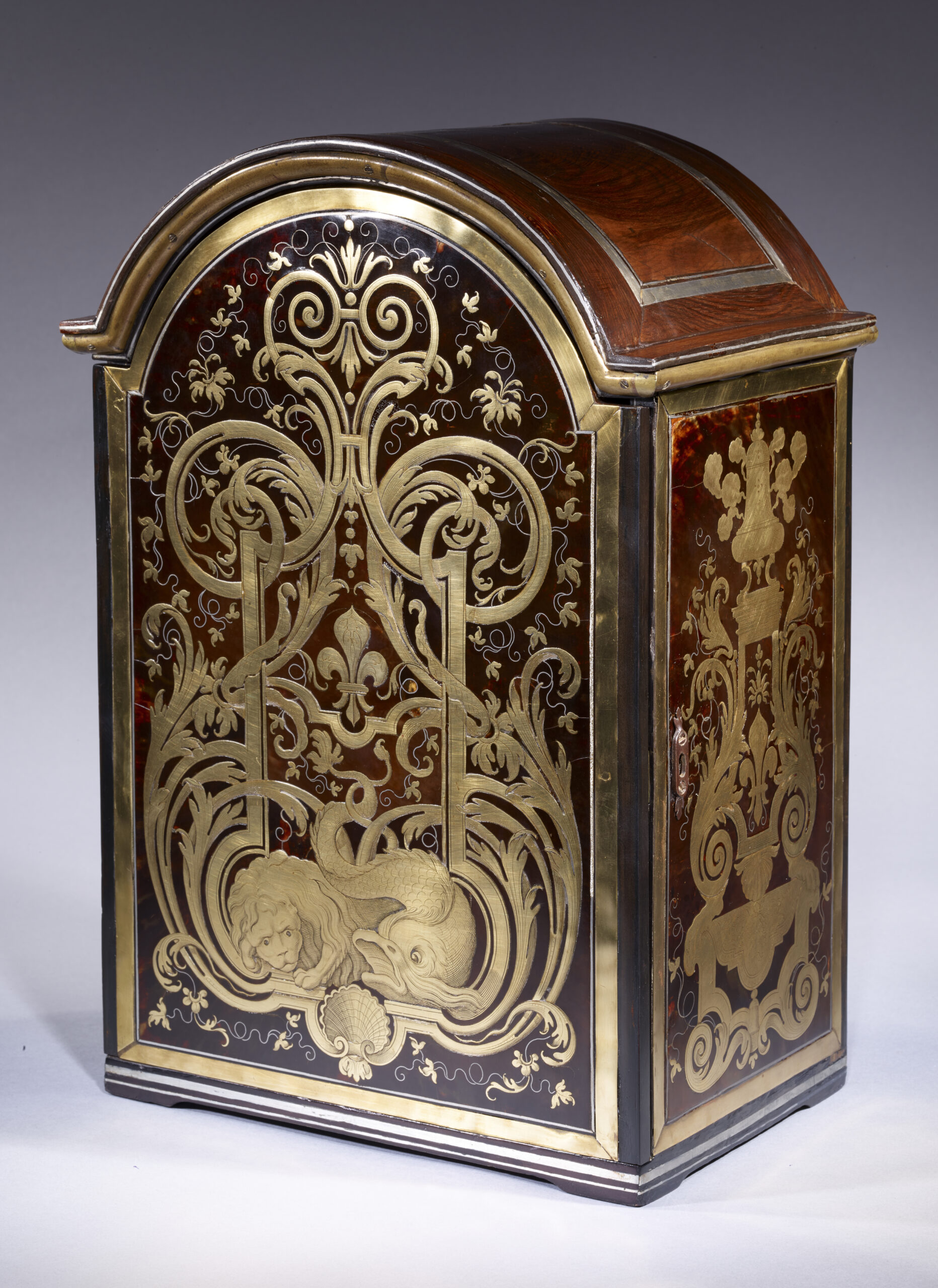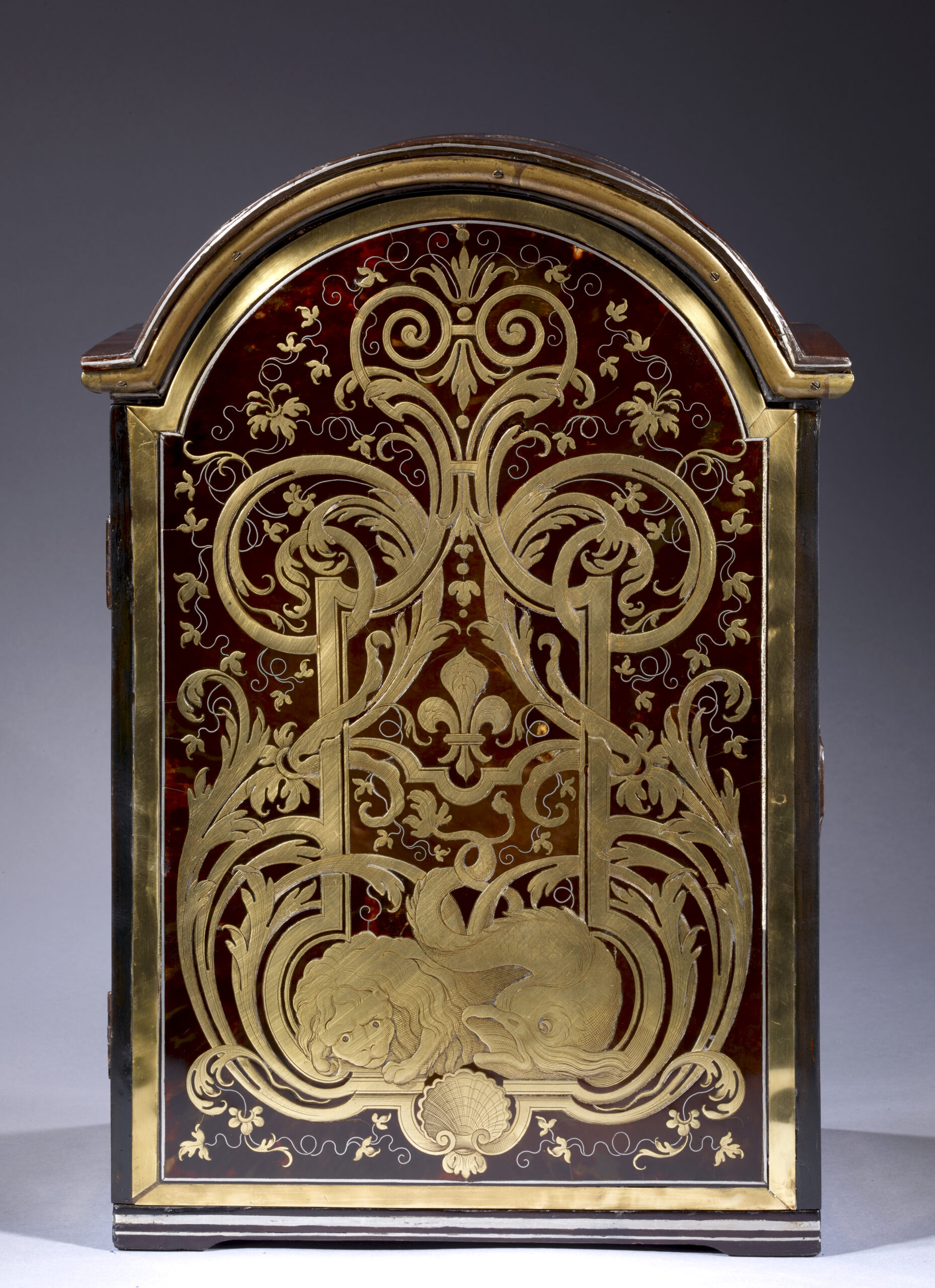 Marqueterie de laiton et d’étain sur fond d’écaille brune ; ébène ; palissandre ; bronze doré ; glace.