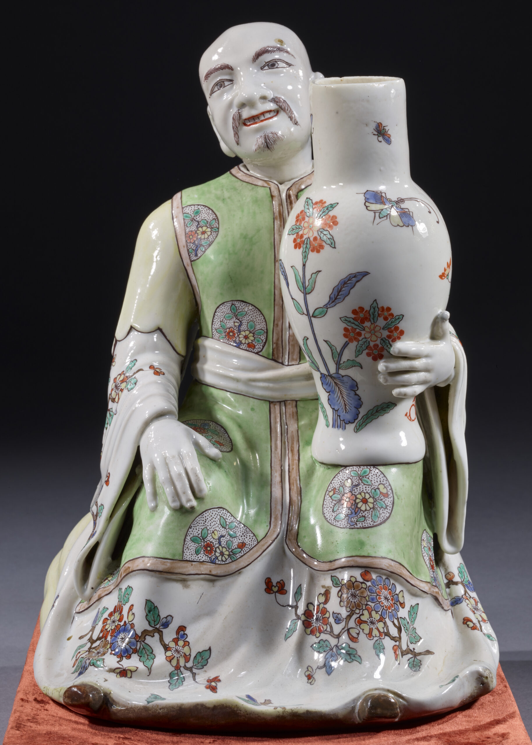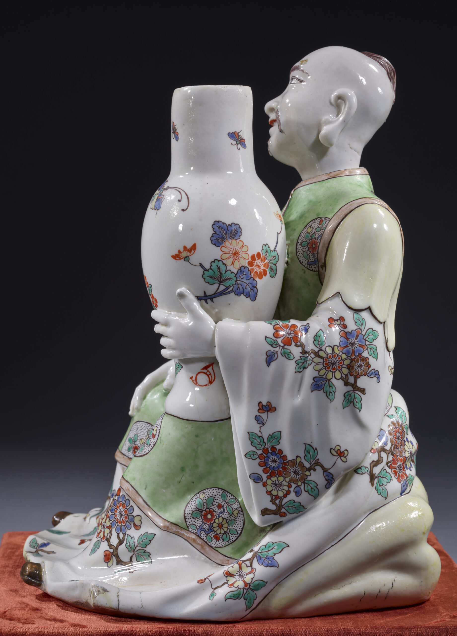 Cette précieuse figurine en porcelaine tendre de la manufacture de Chantilly, à émail stannifère à décor floral polychrome de type Kakiemon, montrant un personnage chinois richement vêtu, assis sur un coussin, et tenant dans sa main gauche un grand vase de forme balustre, constitue un unicum. Aucun autre modèle de cette figure n’a en effet été répertorié à ce jour.
